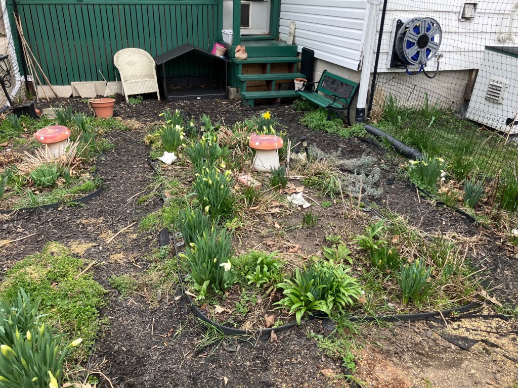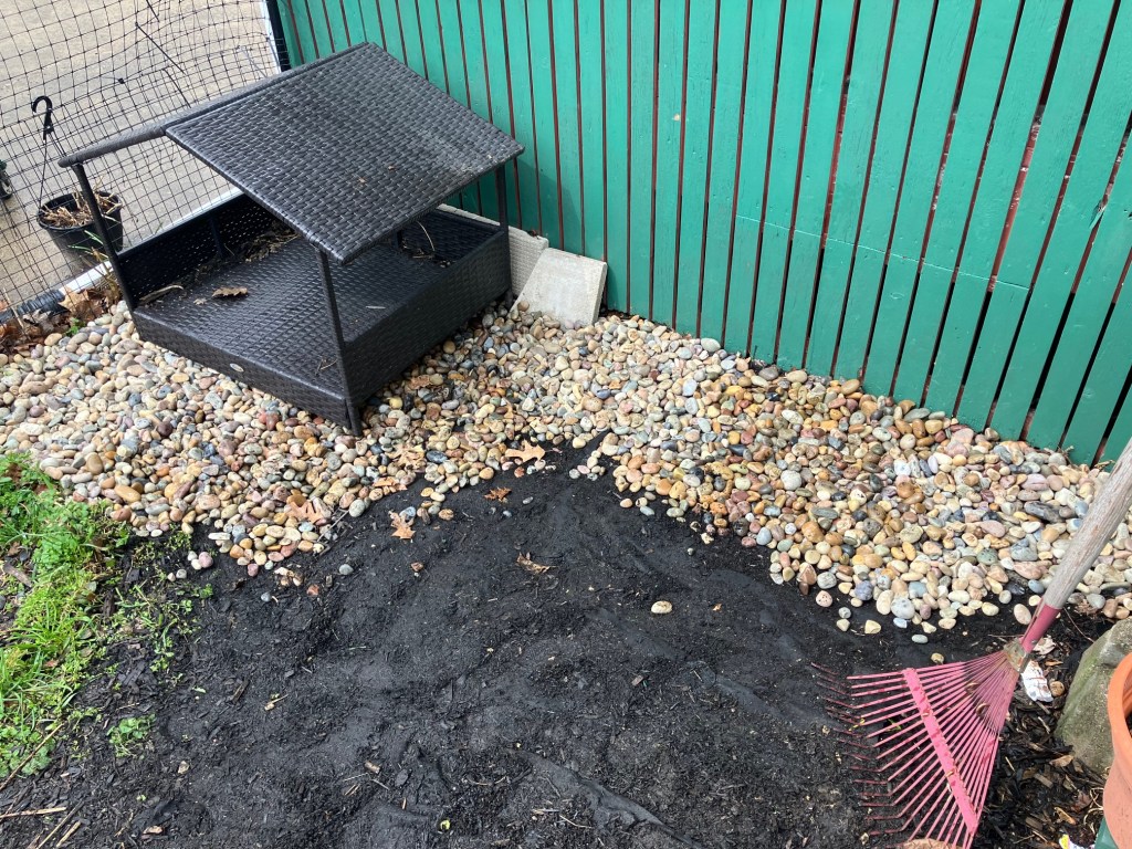 When I created the space, I was on a budget. So I lined the paths and open areas with landscape fabric and threw down some mulch. And it worked well. It wasn’t perfect… it had to be weeded, and replenished yearly… but it worked. Then we got Lemmy.