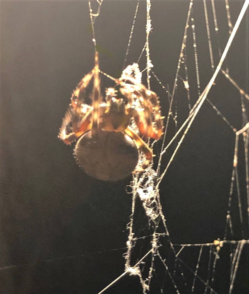 This went on for another week. Out at night, building a web, but gone by morning with nary a trace. A little research told me this is just what cross orb weavers do – build a new web every day! (That seems like a lot of work).