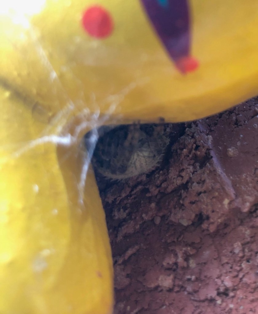 So the other afternoon, I decided to do a little investigating. I poked around, all the places in the area I thought a spider might hide. Under the lights, in the strawberry pot, even down behind the garden cart that sits below the light.