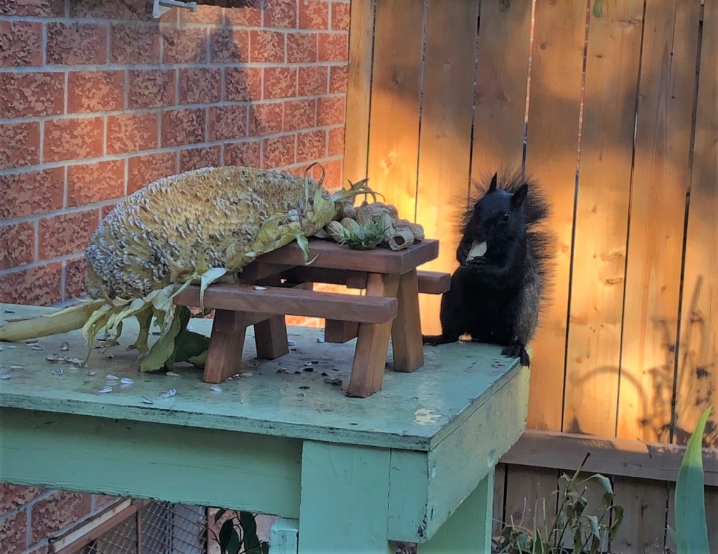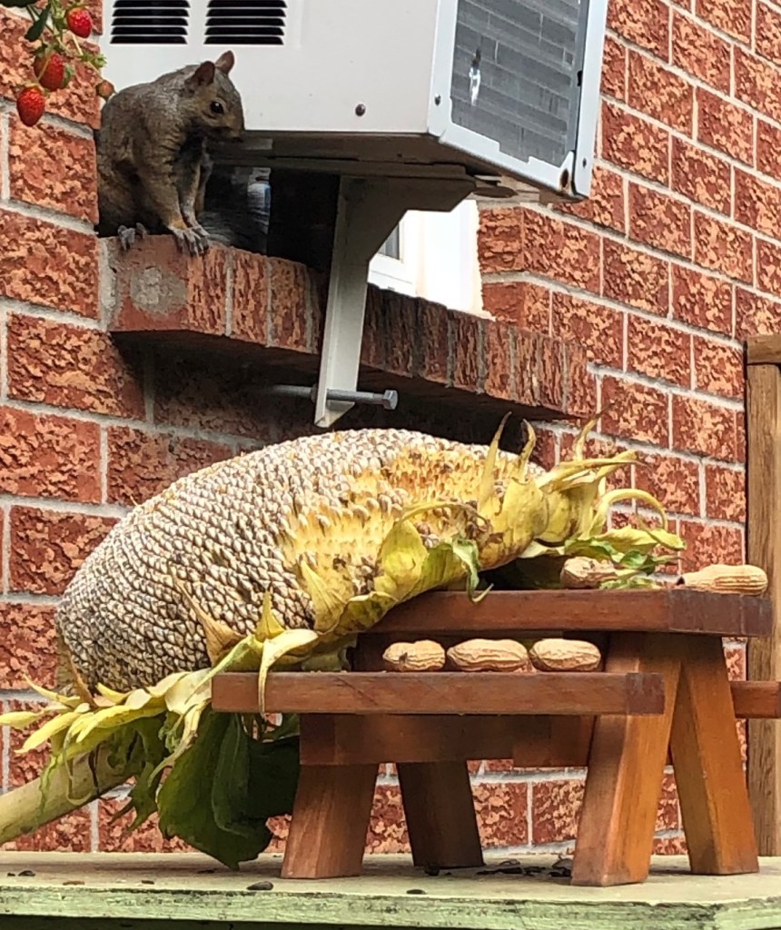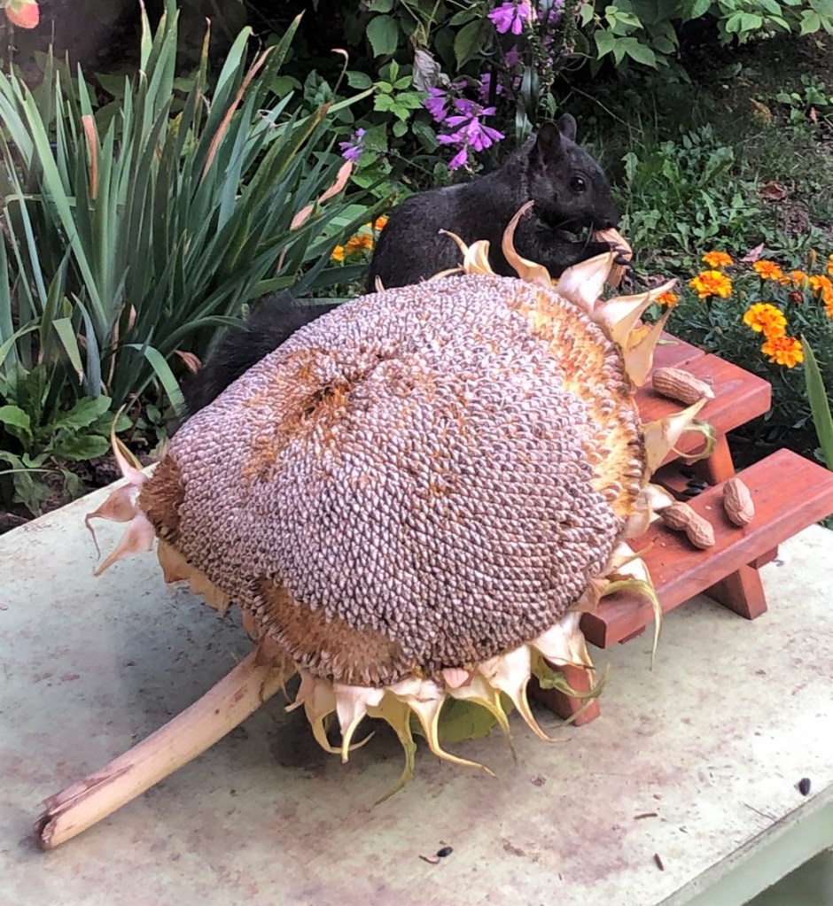 The other day, neighbour Krista knocked on my door. In her hand was the most ENORMOUS dried sunflower head. A friend of hers had grown them and had wondered if I would like one to serve up a Squirrelington’s.