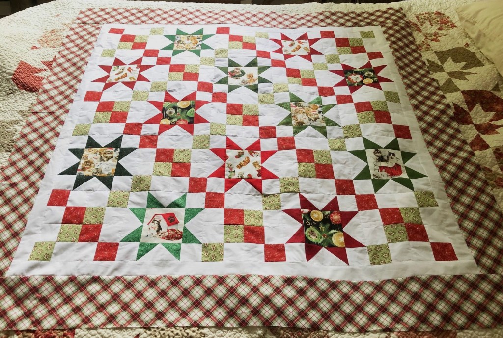 That is such a wonderful quilt! When I saw the first photo, my eyes instantly went to the border. It is such a perfect fabric for the border on that quilt and worth full price. I love diagonal plaids for binding. Your quilt should a great fund-raising project.