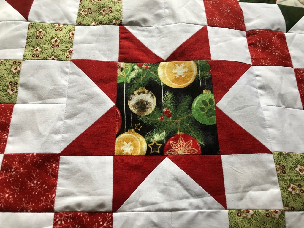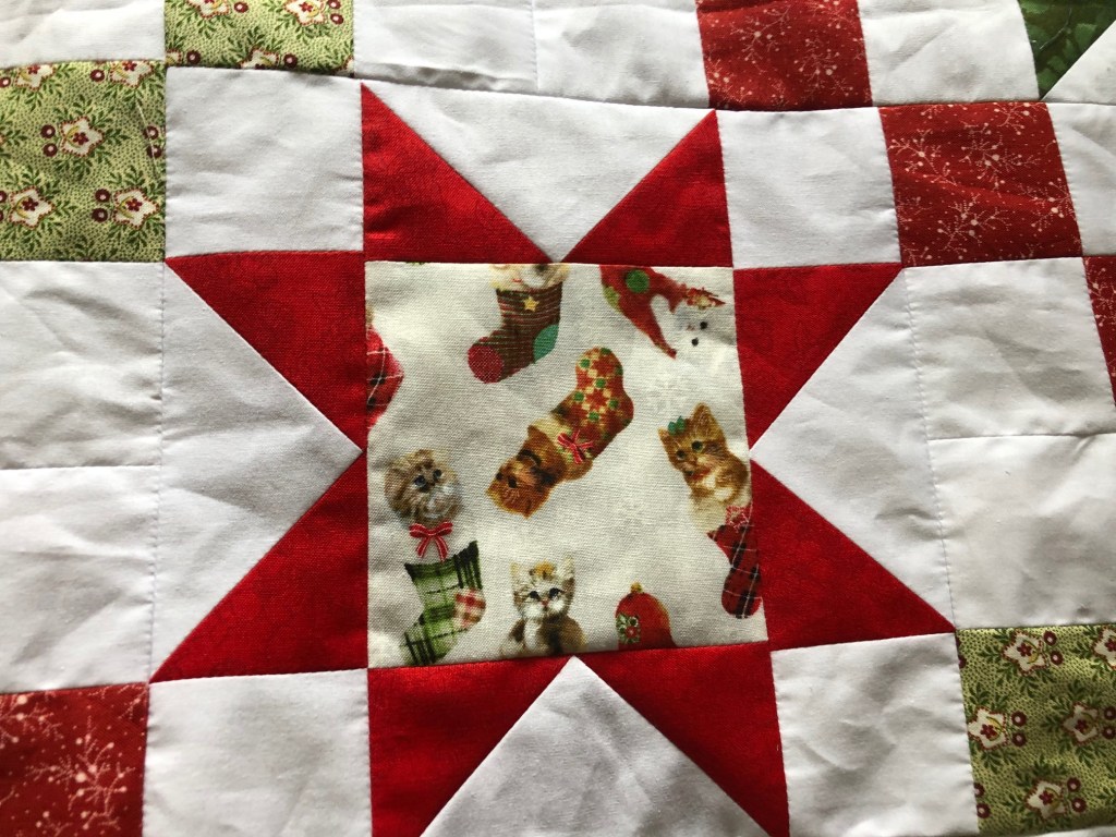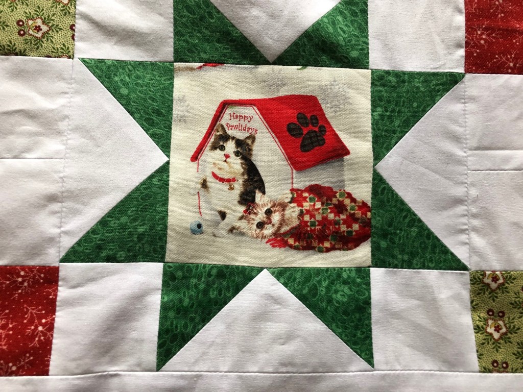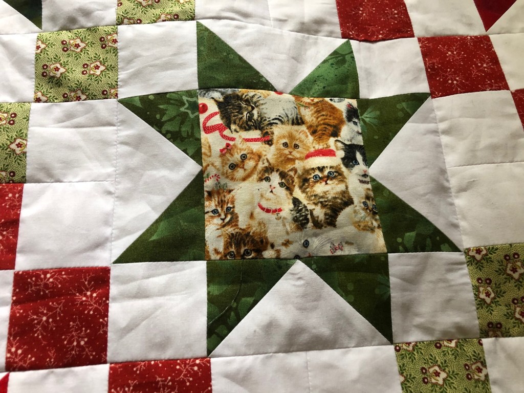 I told you that you’d be seeing more chains in my quilts – I just love them! This one is a nice lap size (about 52″ square), and filled with kitten/Christmas fun!