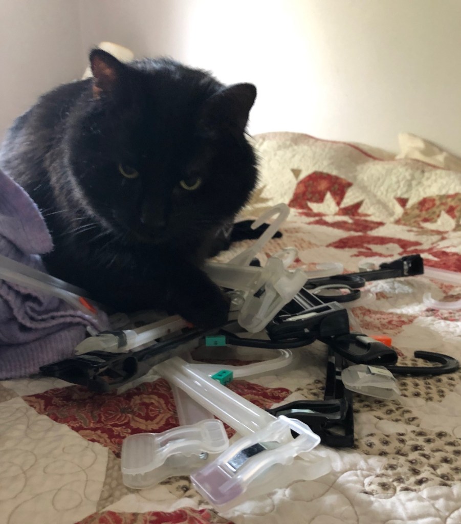 Burton wondered why I had so many skirt/pant hangers when I don’t hang my pants, and only have two skirts. I couldn’t give him a good answer, so into the out bin they went!