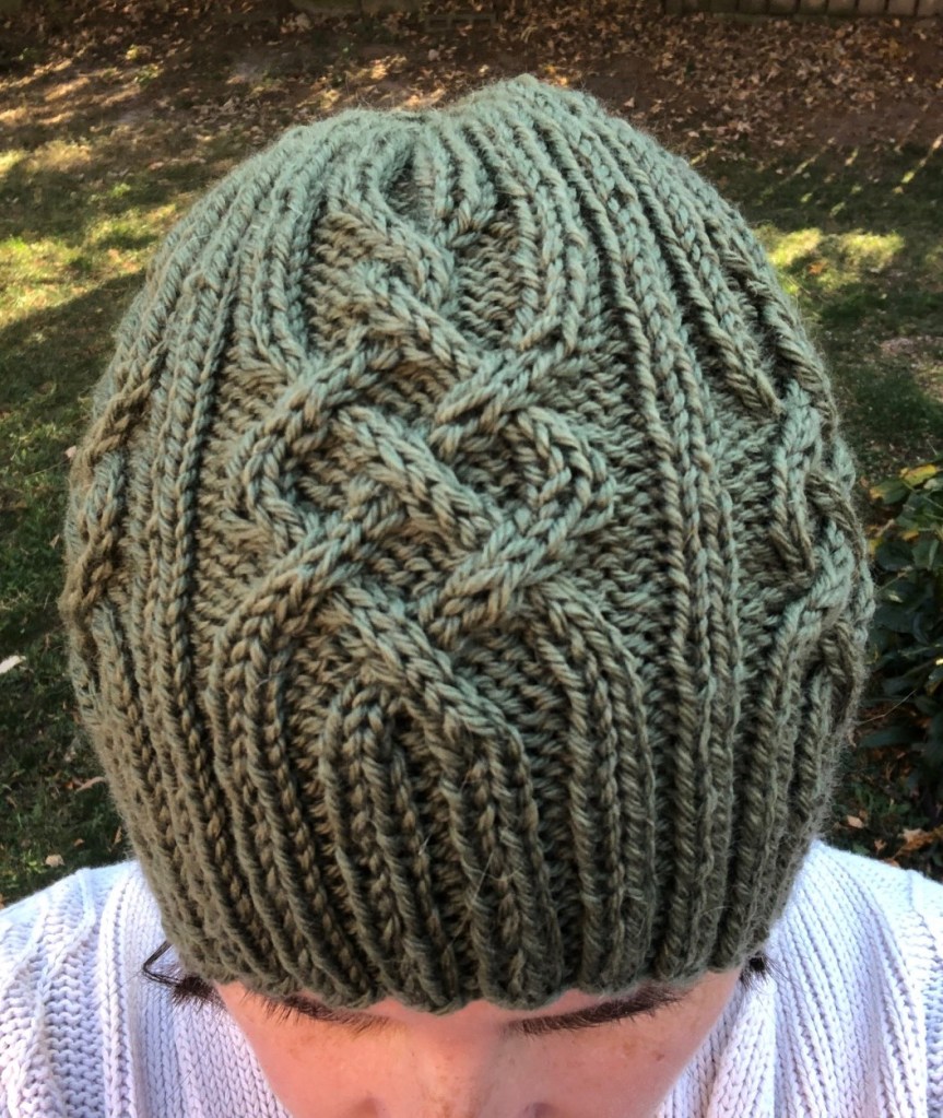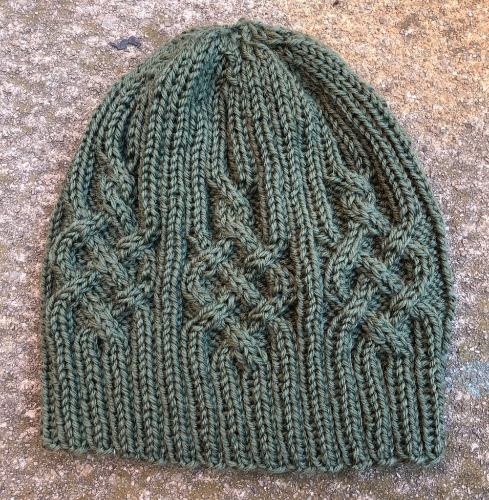 This is the Snowtracks cap, a simple aran-weight cabled hat, with a Celtic feel.
