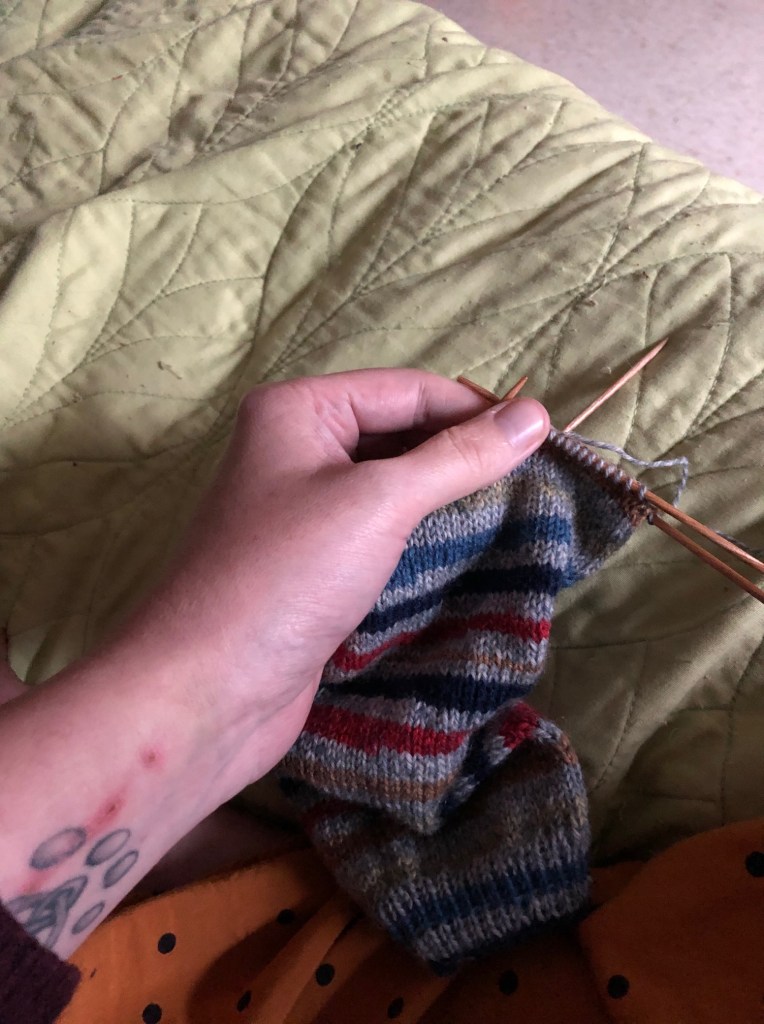 The picture makes it look brighter than it really was. Because the light was dim, I figured working on the sock would be easier than the cardigan, which involved counting rows, and switching colours.