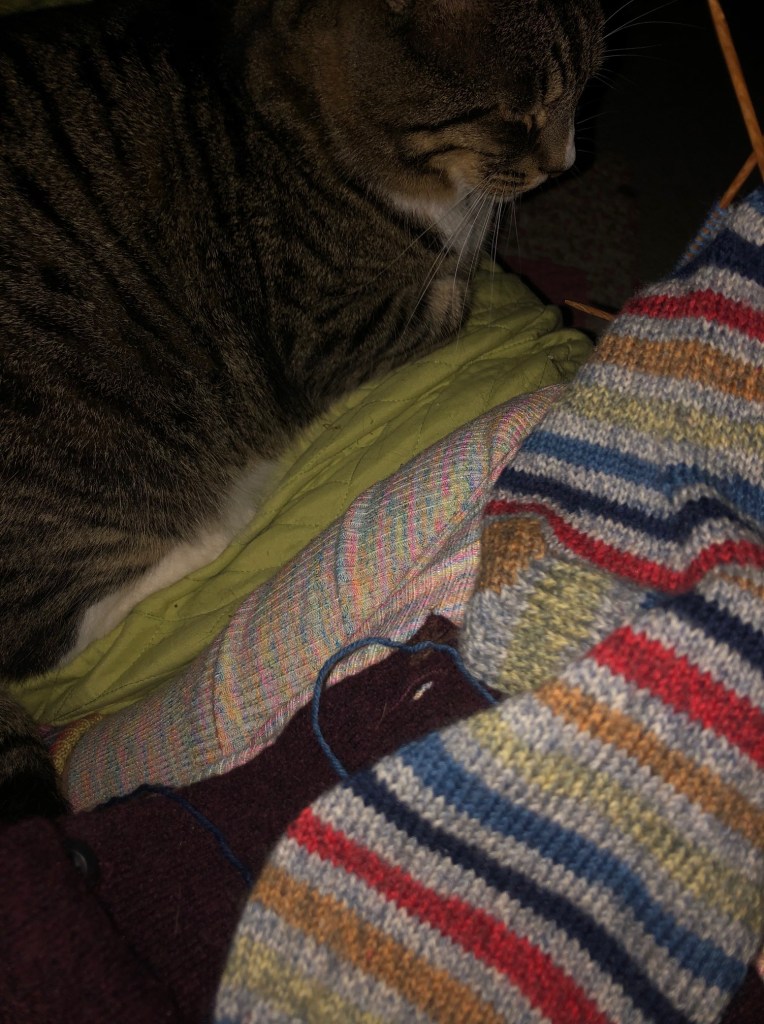 I had lots of blankets and furry companions to keep me warm, since there was no heat. As the hours ticked by, we realized the power was unlikely to come back on before bedtime. So I just kept knitting…