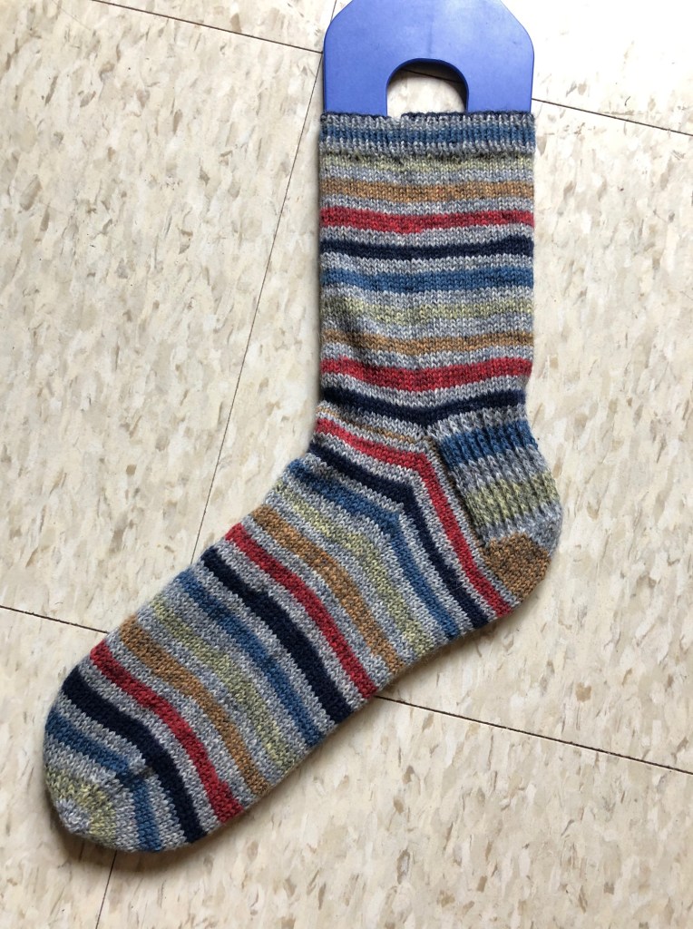 Nice socks! I like that yarn. It feels good to get a project done, doesn’t it? And there’s nothing like a sock with self striping yarn.The best!