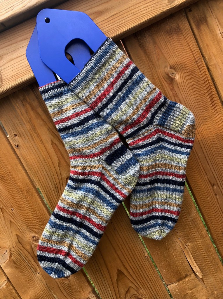 These were a fun pair, but they are nothing fancy. I just let the yarn do the work. I didn’t even use a different yarn for heels and toes as I normally do with stripers. Last post, many of you asked about the yarn – it is Kroy. And you’re all correct – it wears wonderfully. Dave has many pairs of Kroy socks (mostly made by Mom on her sock machine) for just that reason!