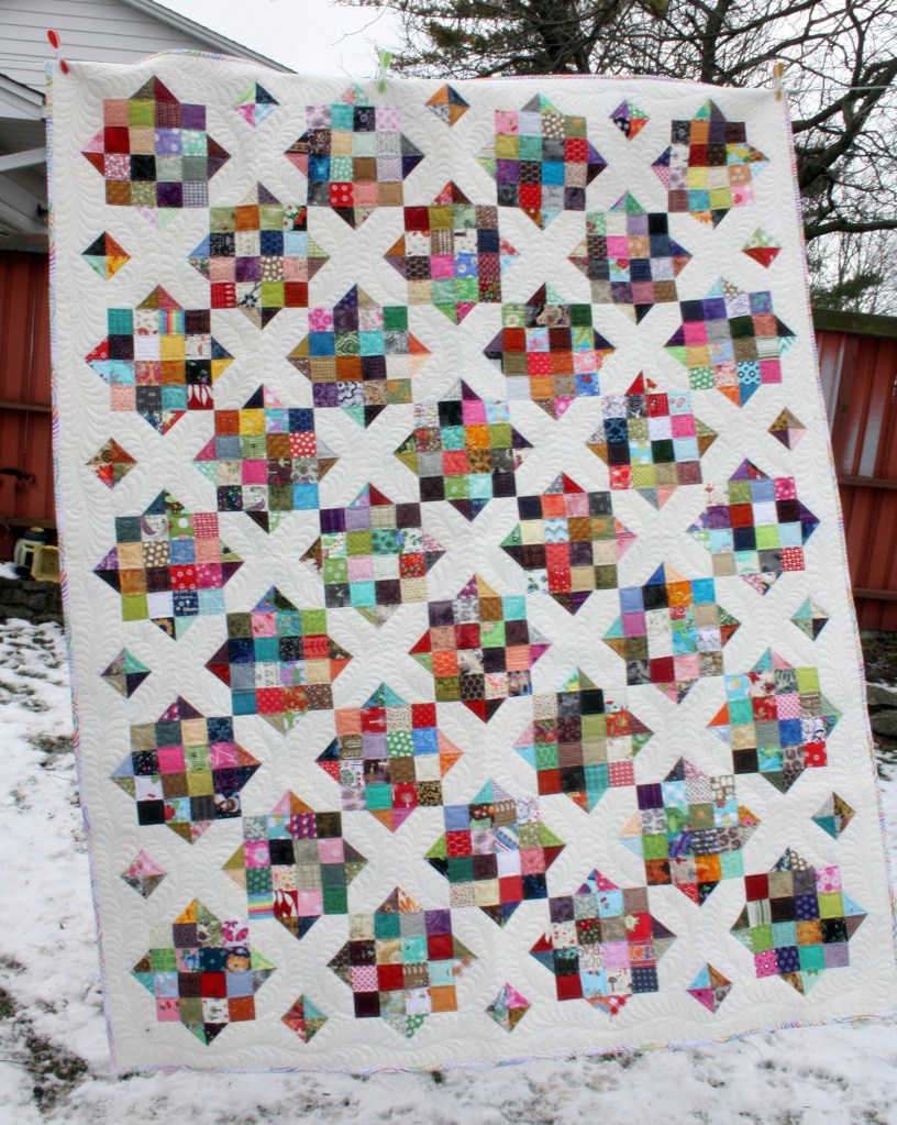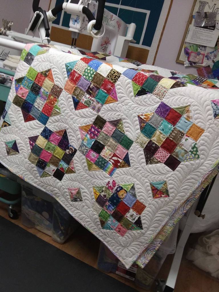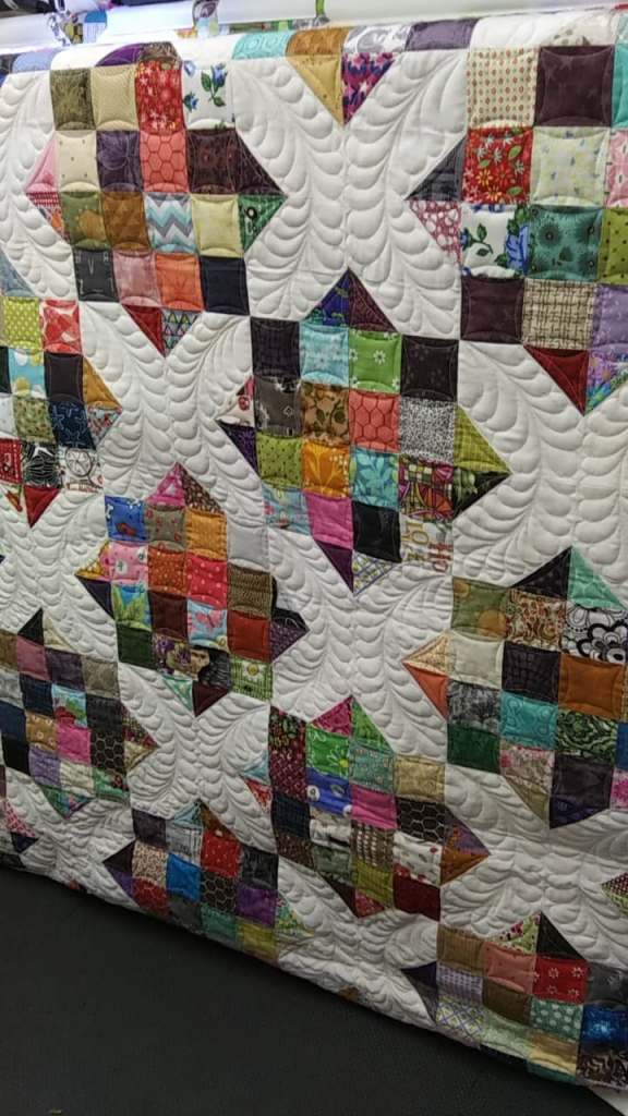 She fancy quilted it and it is just STUNNING (So stunning, it sold in the shop within minutes!) She put her blocks together a little differently than I am, so our quilts will vary a bit. (Plus, I won’t be fancy quilting mine) But it gives you an idea of how it will look….