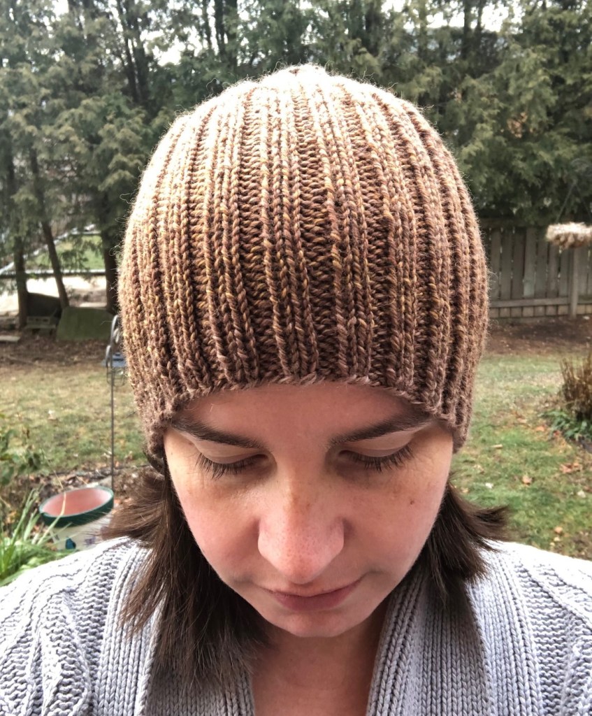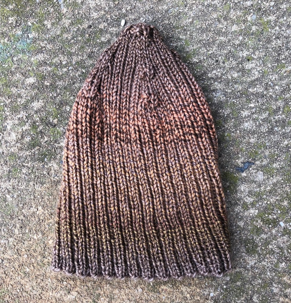 The pattern is Two by Two. A simple ribbed hat. As I said in my last post about it. I was playing yarn chicken… and I think it was a tie. The hat is supposed to have a folded brim. As I was knitting, it was apparent I wasn’t going to have enough to do that, so I started the decreases earlier for a plain beanie style. I can live with that.