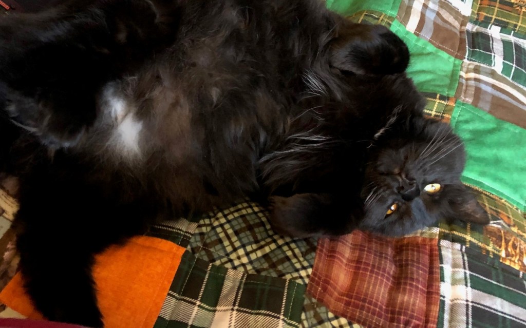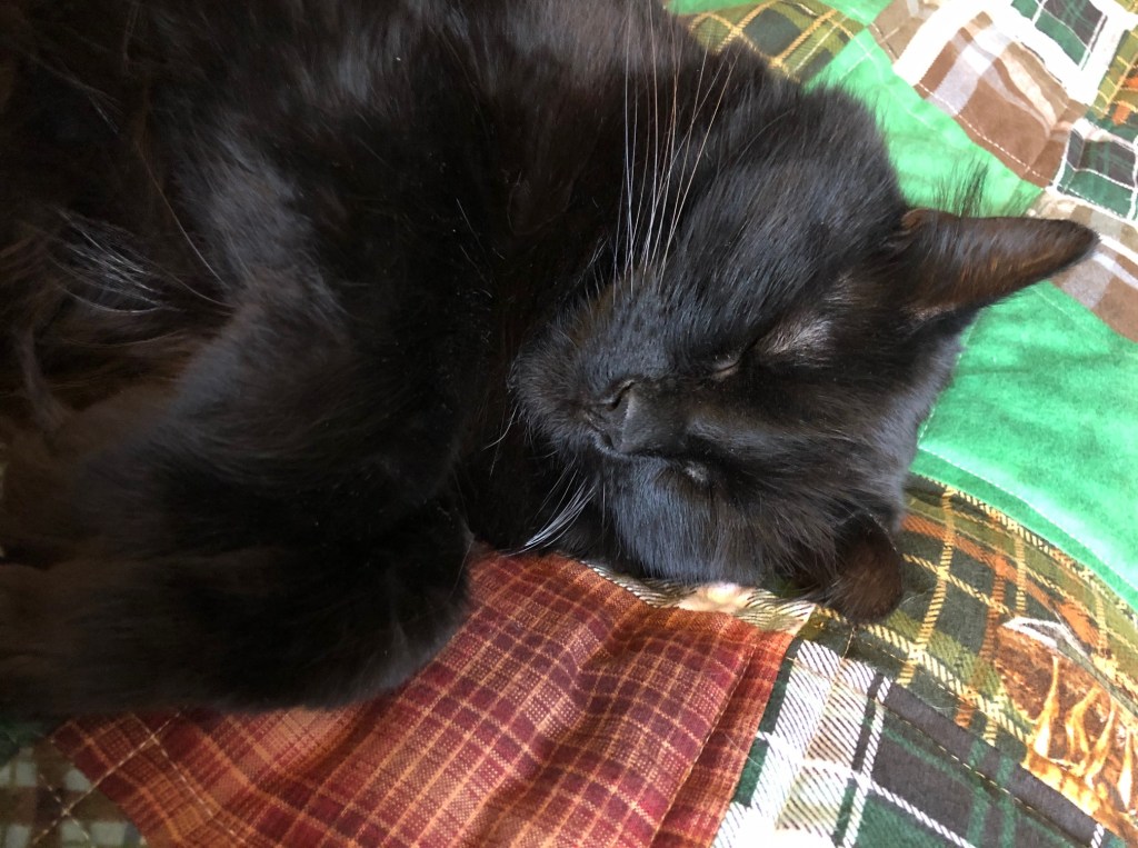 That’s my brother’s cat, Zappa. Zappa thinks the quilt was made just for him. Since I was getting ready to mail all the Christmas gifts to the family, I decided I could sneak an extra present in just for Mr. Z.