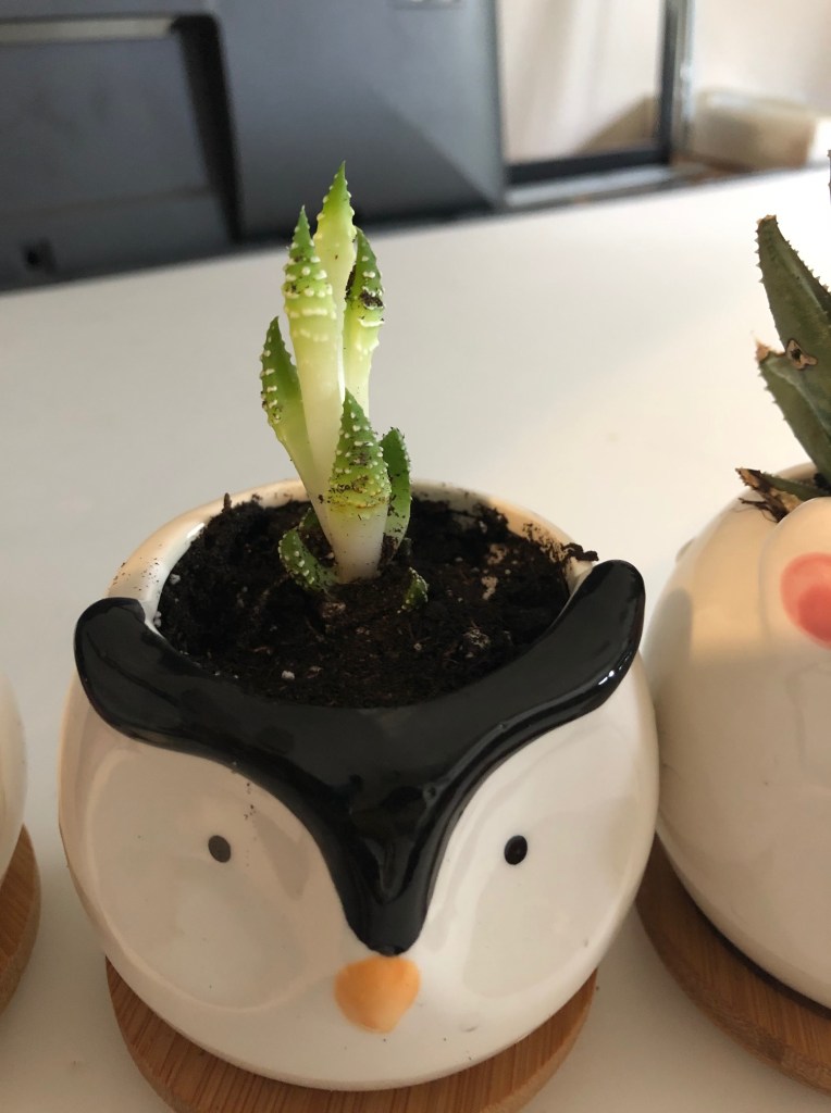 The owl hold a pup from one of my plants – it’s my first time propagating them, so hopefully he does well. The parent got a cool new planter too.