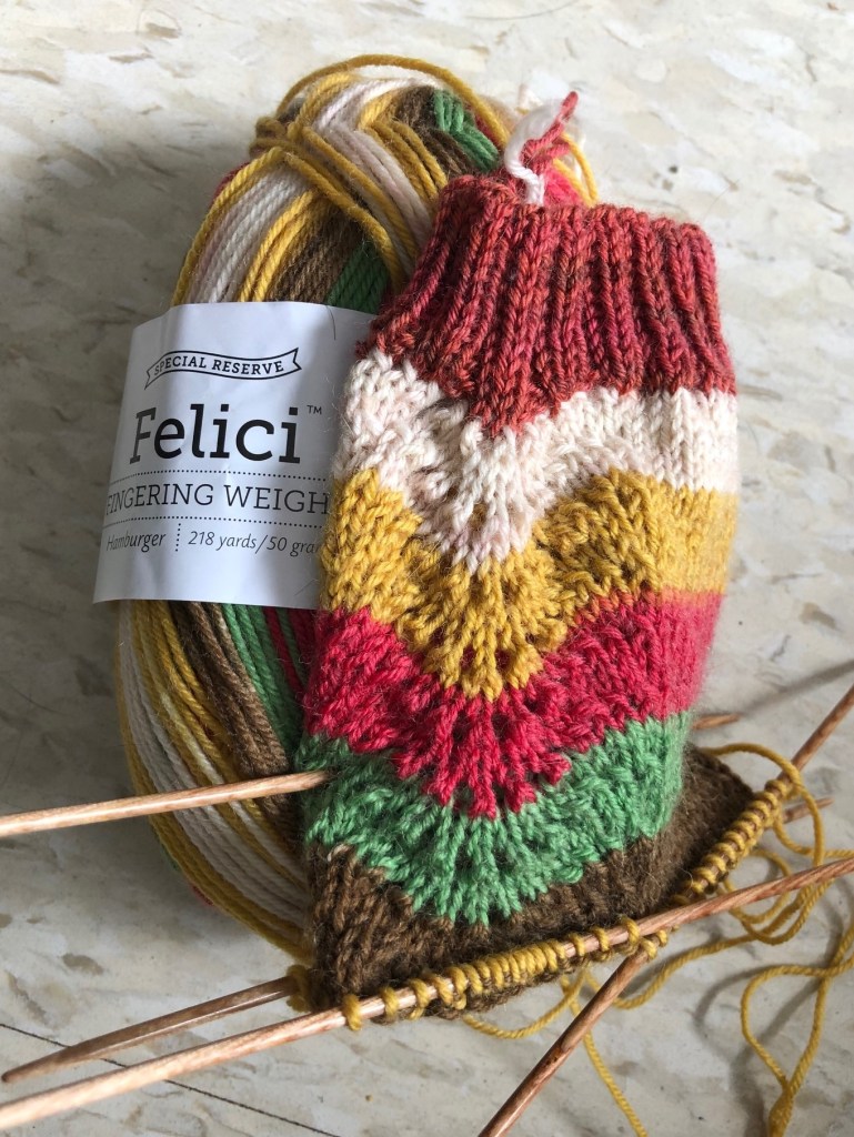 I agree, Felici is so great to knit with. That colorway is hilarious. It does look like a hamburger. The pattern adds a lot of interest too. I’m always tempted to buy more Felici but I have to knit what I have first!