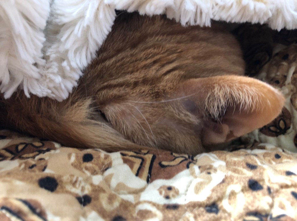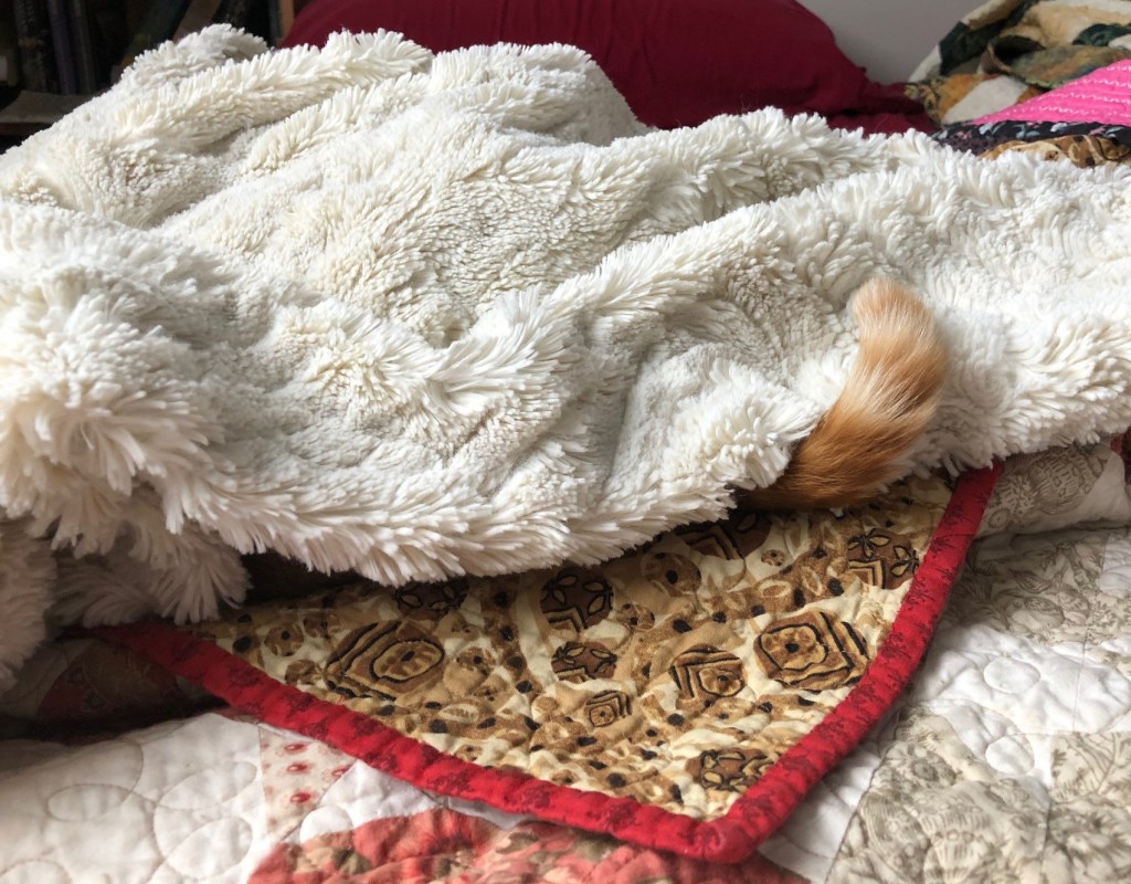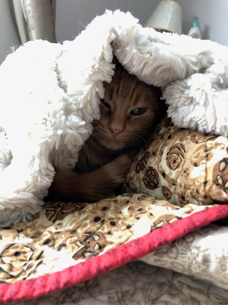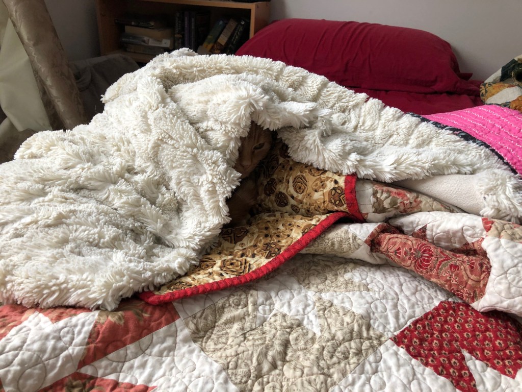 My cats spend a lot of the day on our bed; it’s cozy. I can’t bear to strip the sheets when they’re snoozing there. So today while they were downstairs having lunch, I did it! Biscuit came back and gave me the look of betrayal. Soon, kitties, soon, there will be a freshly made bed again!