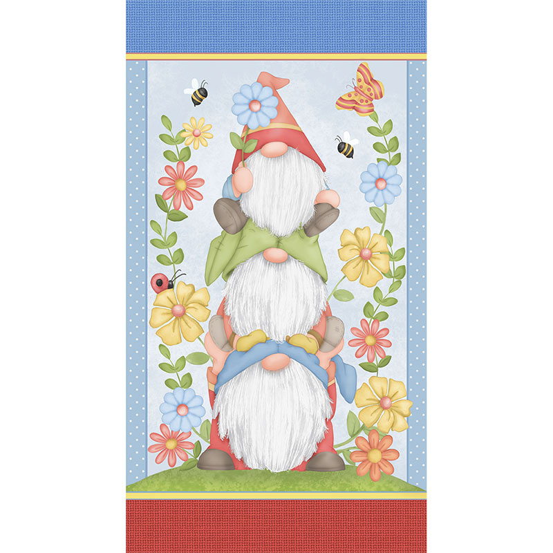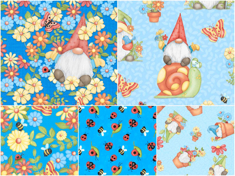 Have GNOMES!!!!! I have some fabric set aside for a winter gnome quilt…. but I decided I had to have a spring/summer one too! I bought an extra yard of the flower & bug fabrics (bottom left and bottom middle) to give me more options. I learned with my second Blockhead quilt that it’s nice to have one or two fabrics from the line in larger amounts for borders or things like chain blocks.