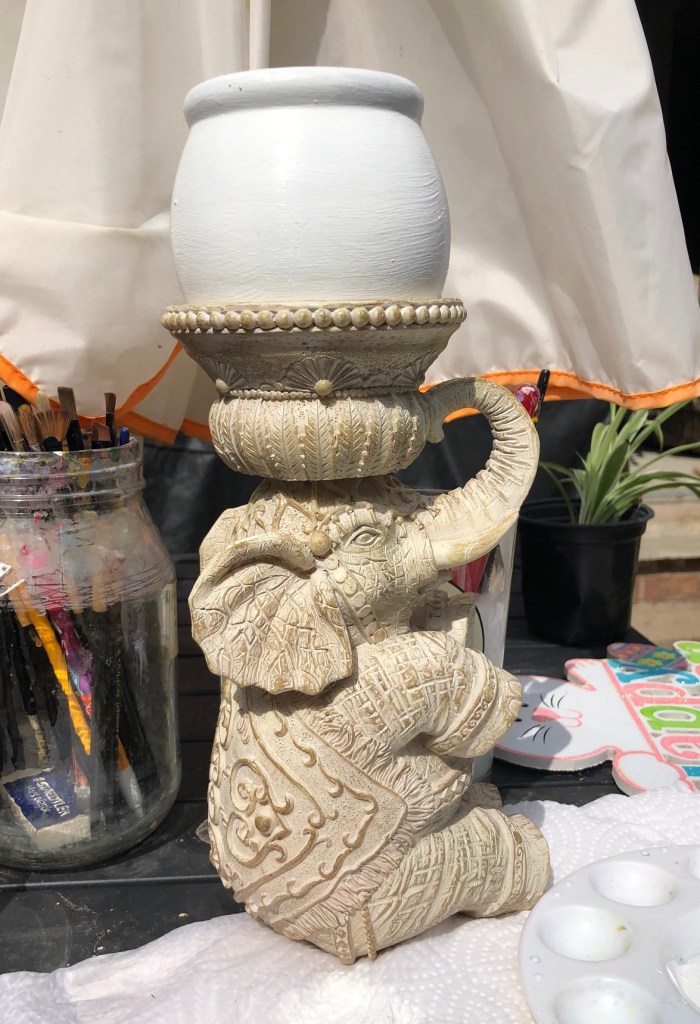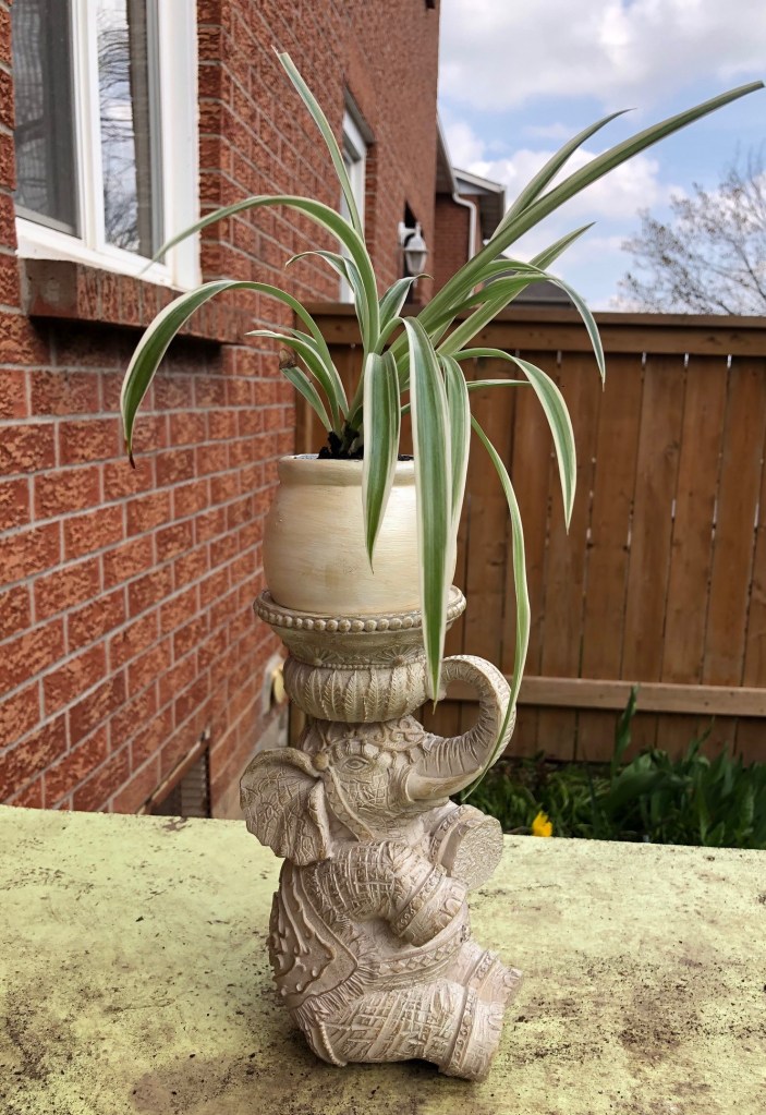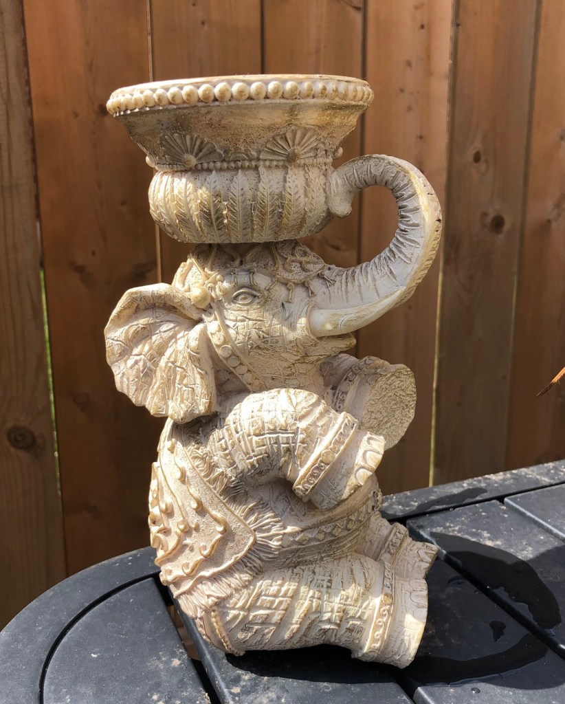 I, of course, have my Blue Mountain Heffalump, and I have another elephant plant holder, (on which my snake plant resides.) I told her I used to have a white eastern-style elephant that I used as a small plant stand but that I hadn’t seen him in years, and I wasn’t sure what had happened to it.