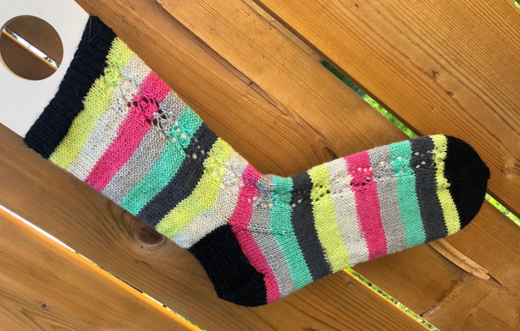 But isn’t it cute? Such fun cheerful colours! And that little bit of lace to keep it interesting. The pattern is I Smell Snow, and it’s nice and easy to memorize.