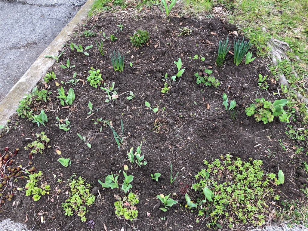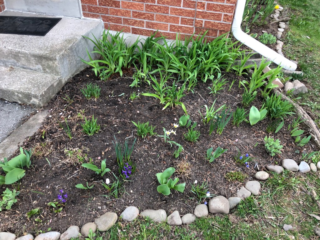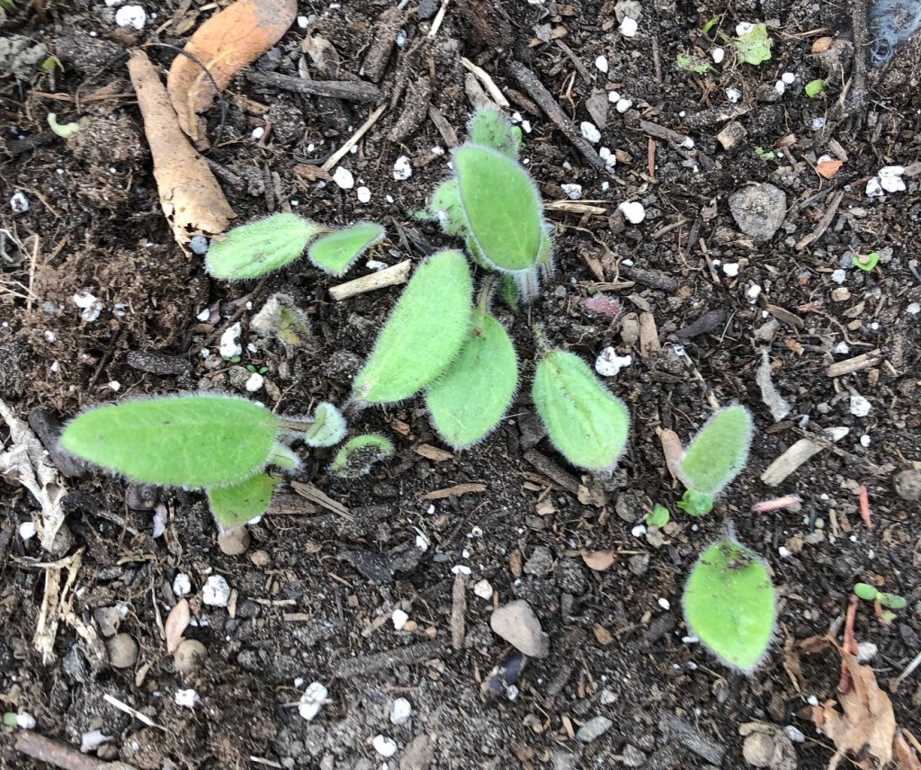 The black-eyed susans in the front garden have never been overly robust (again, not as much sun as they really need), but they have managed to reseed themselves – these little fuzzy leaves are coming up all over the place in that garden.