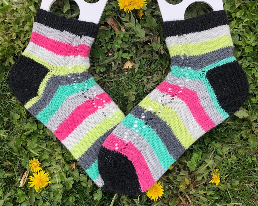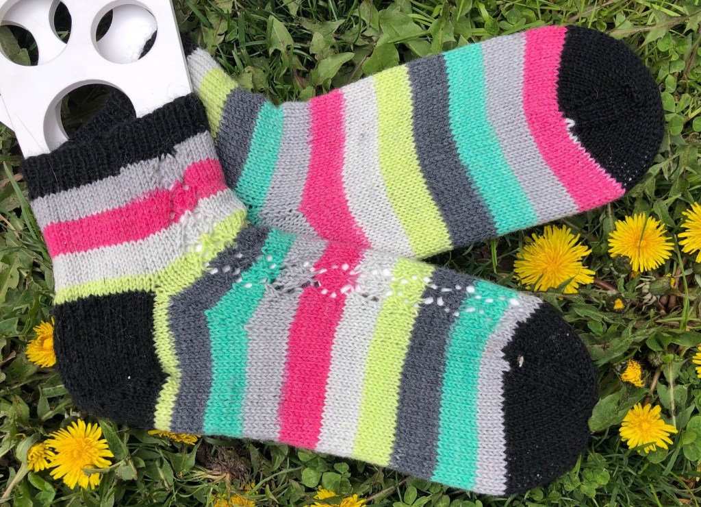 They are just the same at the pair I made her sister – just shorter!. Pattern is “I Smell Snow” and the yarn is Knitpicks Felici in the Summer Camp colourway.