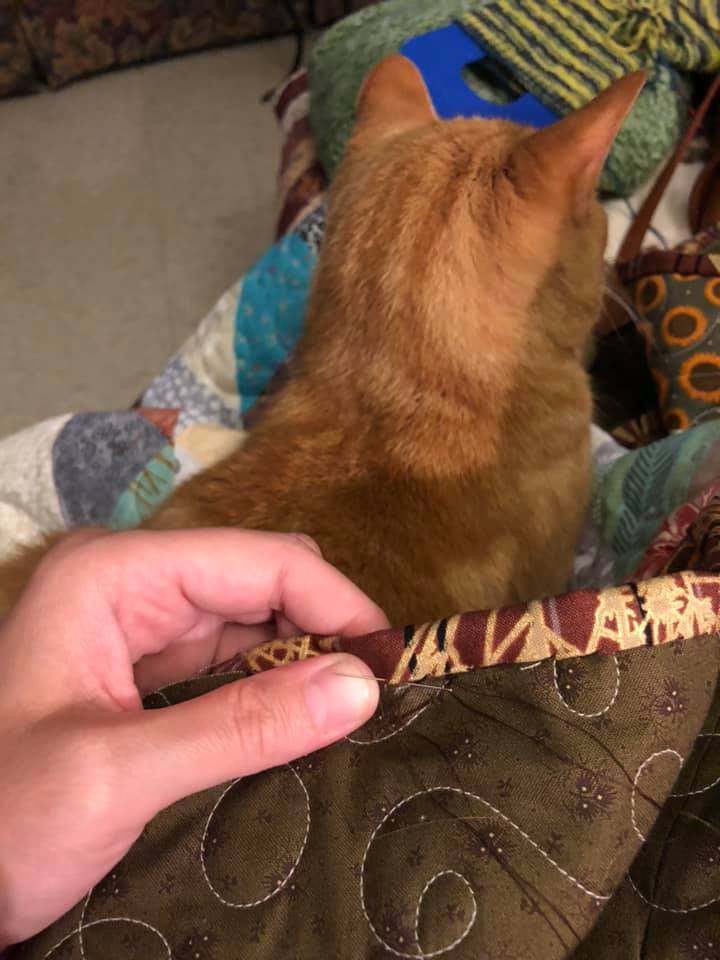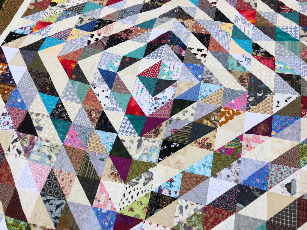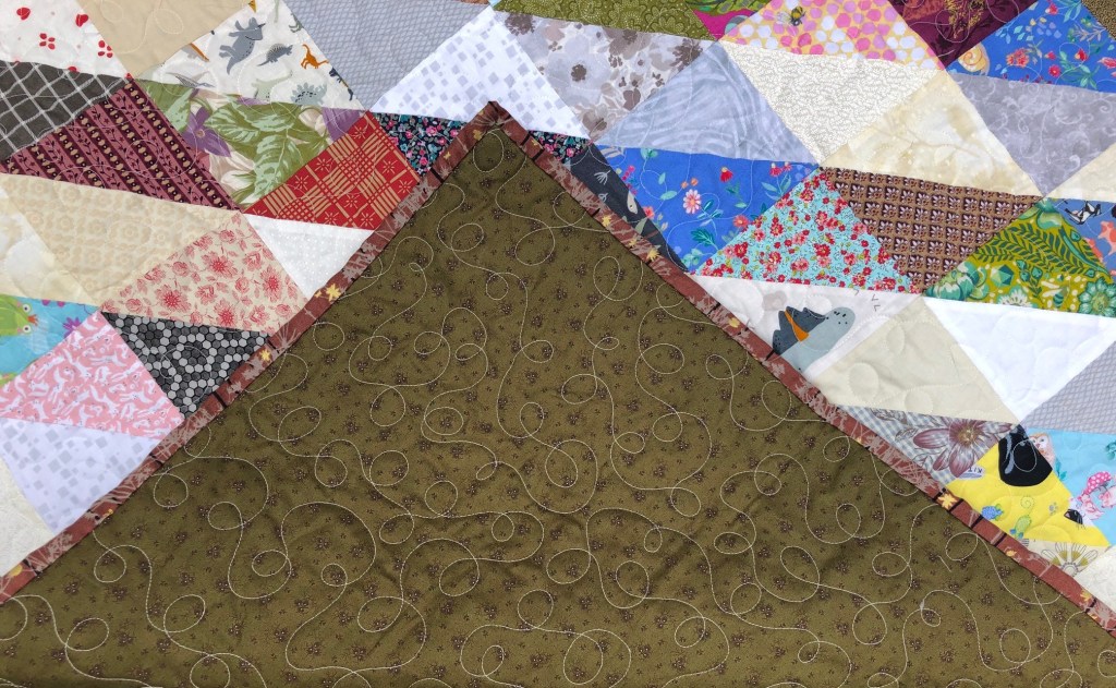 That is such a pretty quilt and all leaders/enders! I love the binding which seems to have all colors in the print. Rupert must have been very helpful to have all that binding stitched down in one evening.