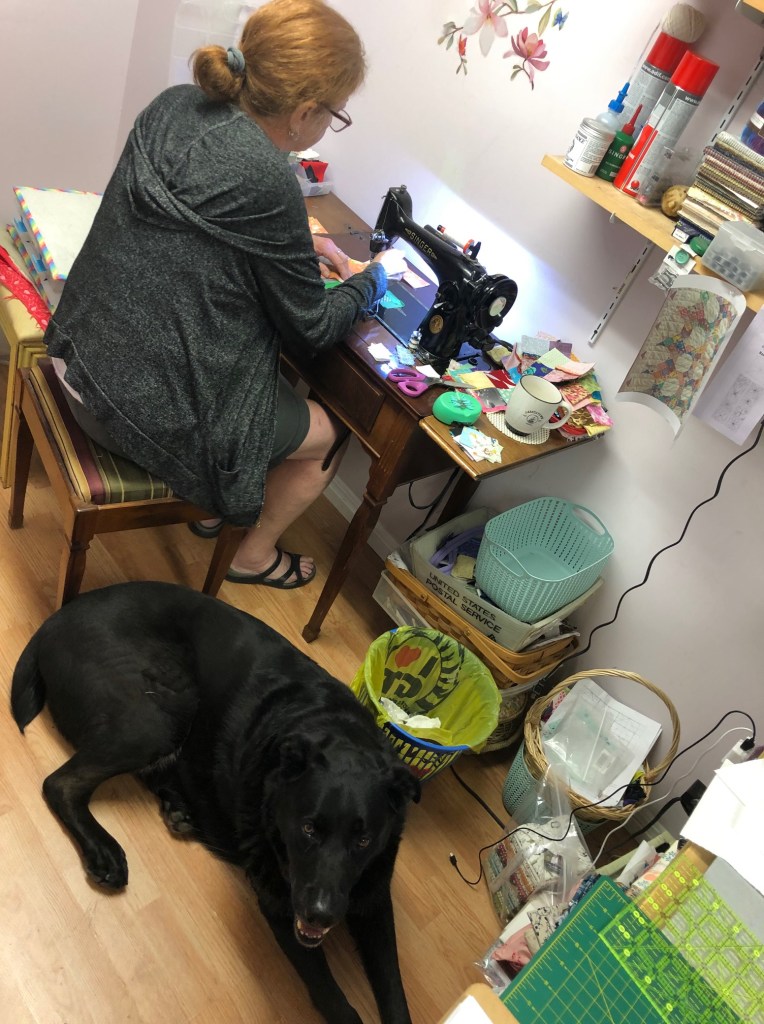 (she pieces while I use the longarm on the other side of the room -and Chevy keeps an eye on us both)… I also get away from the stress of the move.