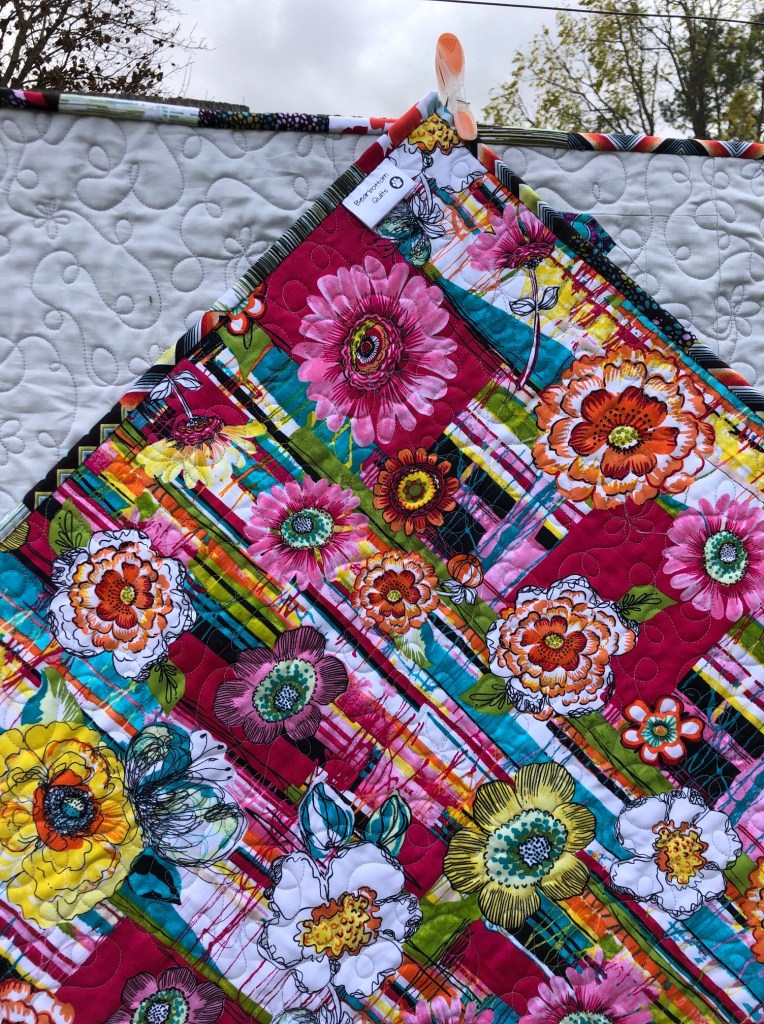 Whoa….that backing was a surprise! It’s perfect for such a happy quilt. I love your little loops! I need to graduate to something better but it’s just so hard to drag that material around the machine bed. I need to try one of those slider things as much as I hate to spend the money.
