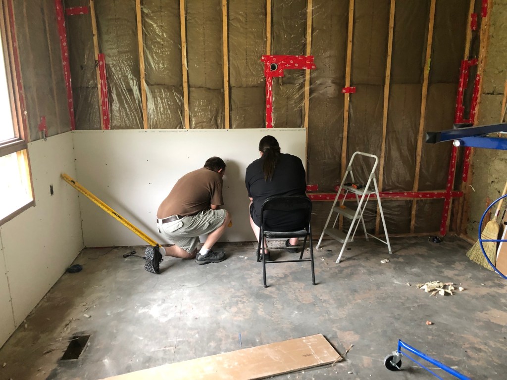 Because we had to hang drywall anyway, Dave took advantage of the opportunity to run speaker wires for the surround system behind it, and install a conduit to house all the TV/Internet/Component cables. The little bit of wire you can see at ground level will all be hidden by baseboard. The system looks wireless, but actually isn’t! He’s very proud of that.