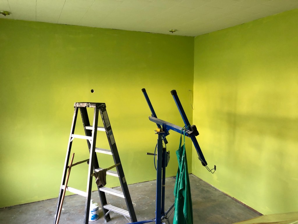 If I’m remembering my measurements correctly, the room is about 13.5′ x 13.5′. A nice cozy size for the two of us. There are still things to be done – baseboard and cove trim, as well as a new window and window trim, but like Dave’s studio, it’s about 98% complete.