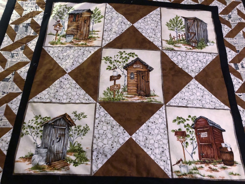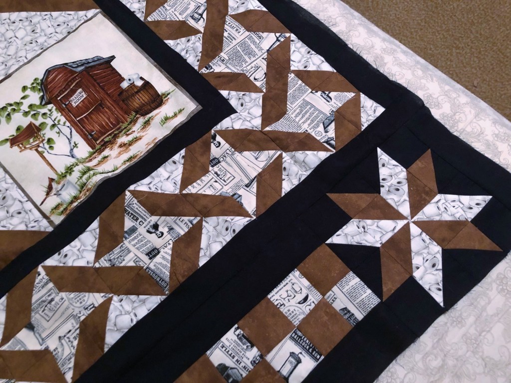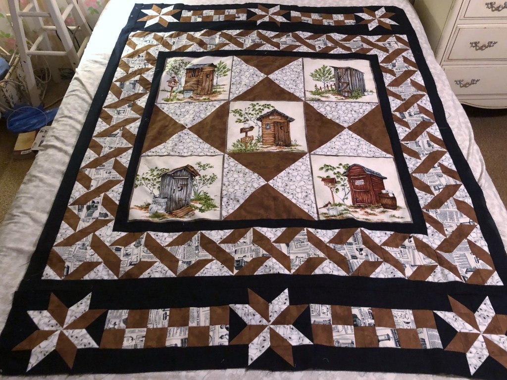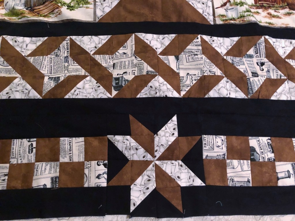 The last gift quilt is now a completed top! This is, of course, the outhouse quilt I’m making for my brother. When last you saw it, I had completed the friendship star border and was trying to determine if I should do another full border or just top and bottom.