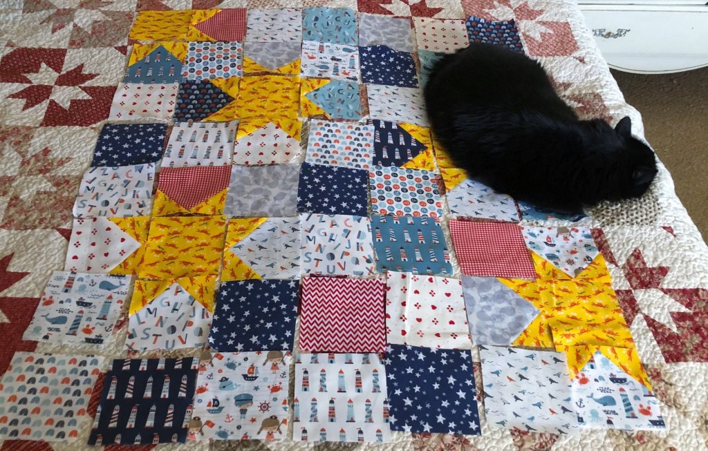 After finishing Ahoy Matey, I cut the rest of the fabric into 5 inch squares intending to make and Oh My Stars baby quilt with it. After they were all cut, I didn’t have quite enough (you need at least 56, though 64 or 72 is even better), so I went through the stash and scrap bins and came up with a few more prints to round it out.