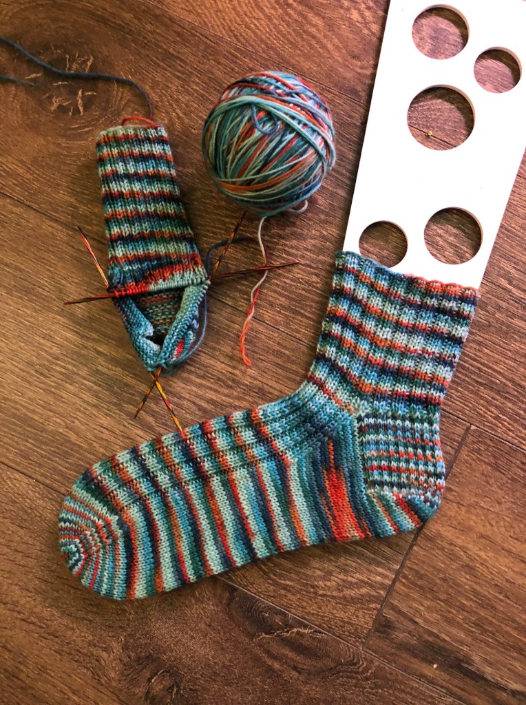 There’s been no work on the Hemlock Ring blanket, as I await arrival of the longer needle. (It should be here this week.) As such, my Koi Pond socks have been getting lots of love.