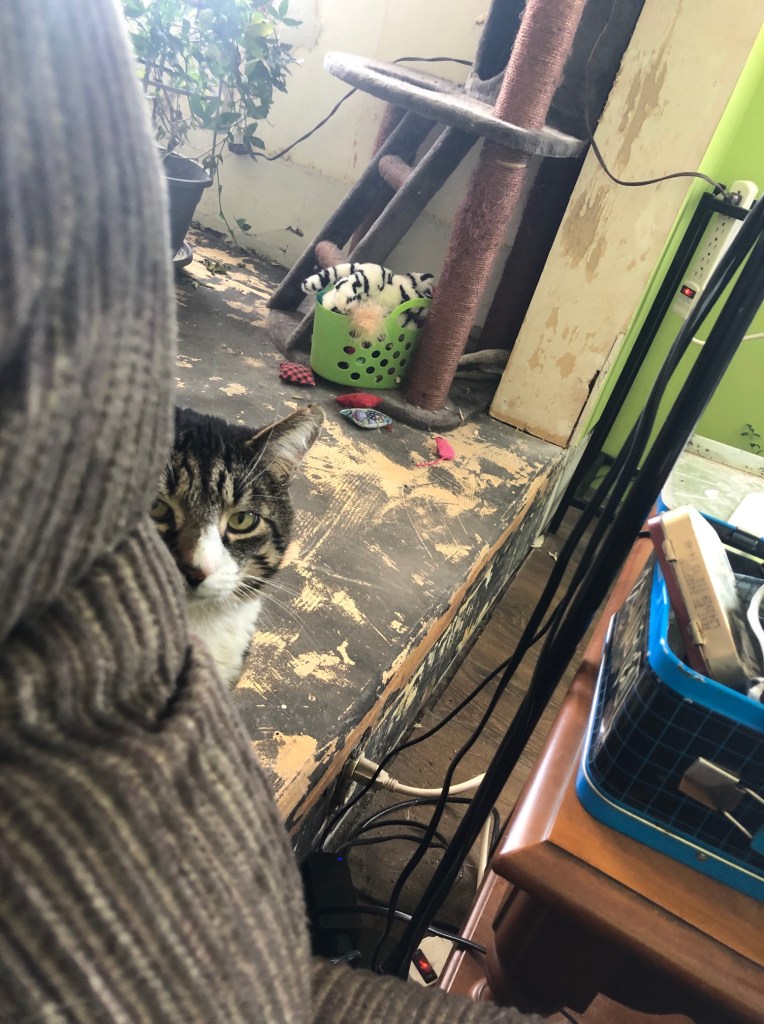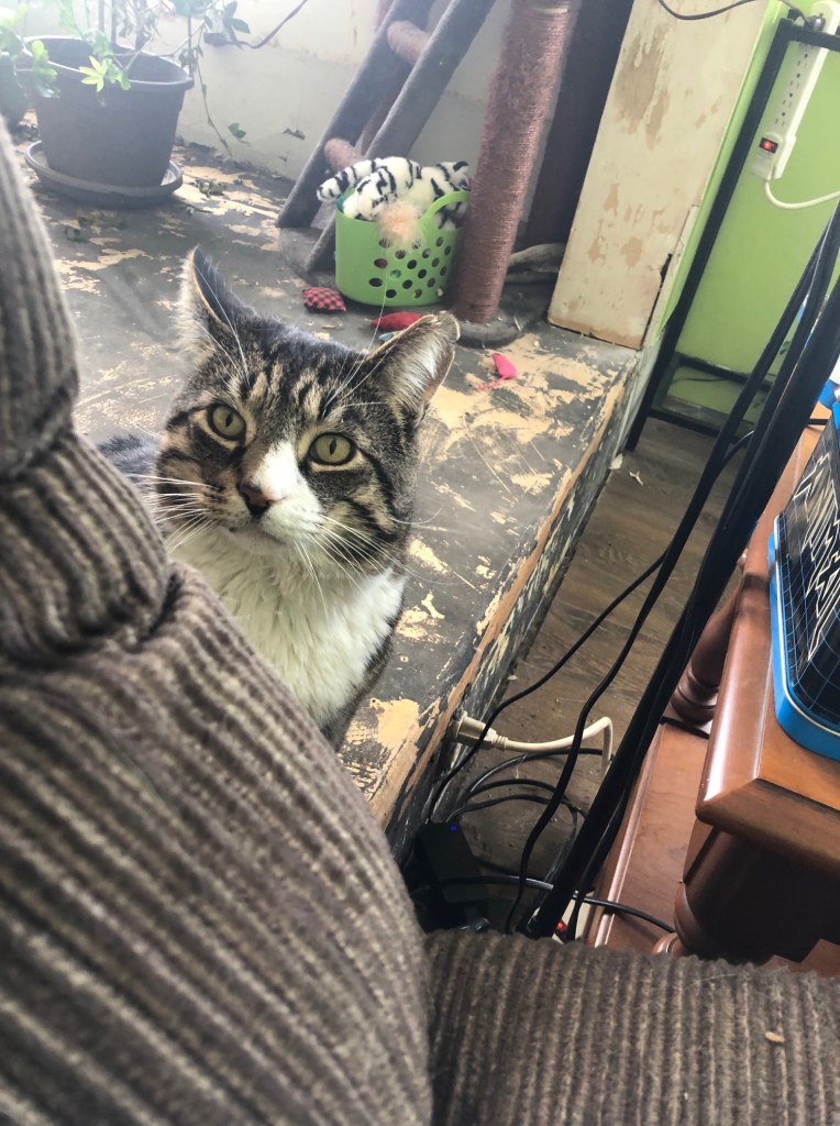 A cat never knows when a kibble, treat, or piece of snack will fall from a human, so it’s best to keep eyes peeled!