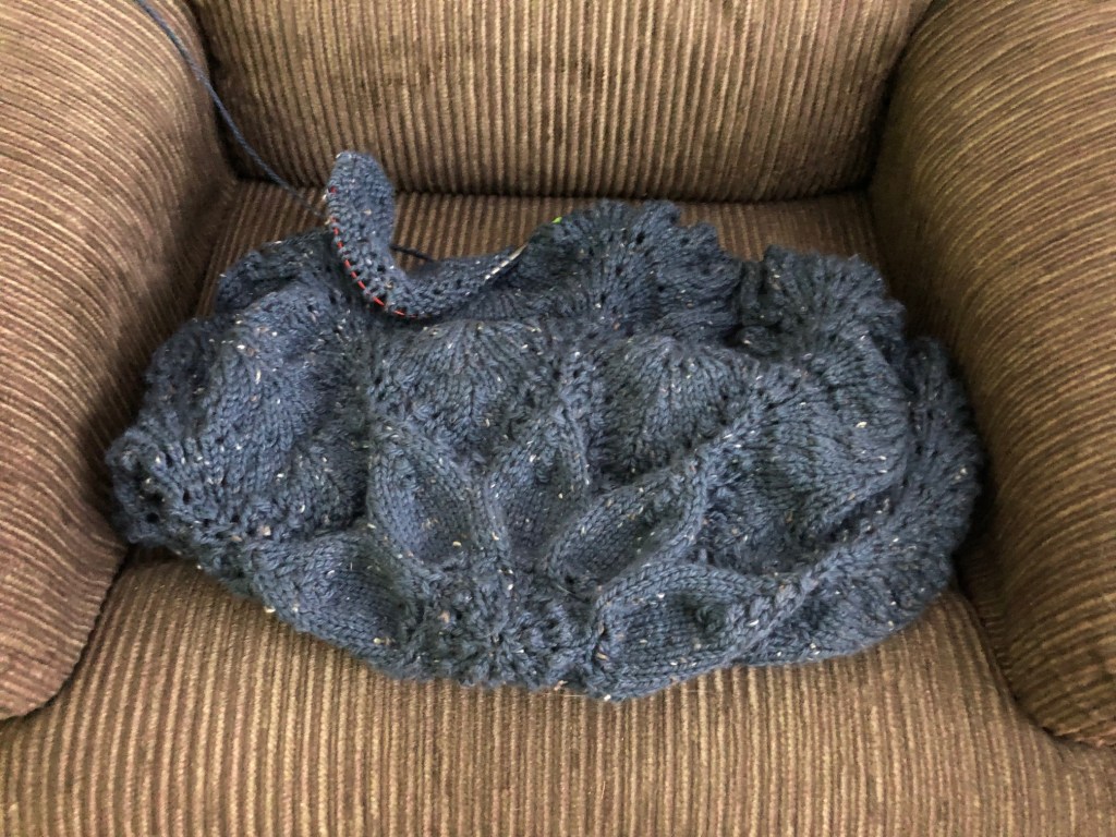 Although I’ve had the new longer needle for the Hemlock Ring blanket for a while now, I wanted to get Wren’s bolero out of the way first. It’s blocking now, so I finally picked up where I left off with Hemlock Ring.
