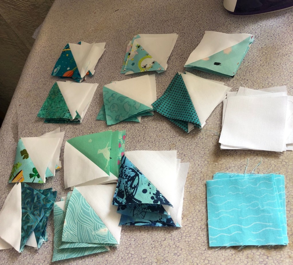 The colour for February was aqua/teal, and I had a good selection of scrap for it. WIth all my scraps already pulled, I just had to cut some more white fabric. Once that was done, it didn’t take long to make the HSTs.
