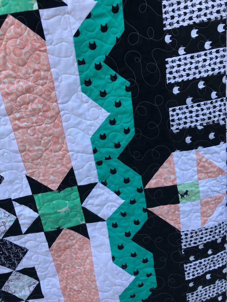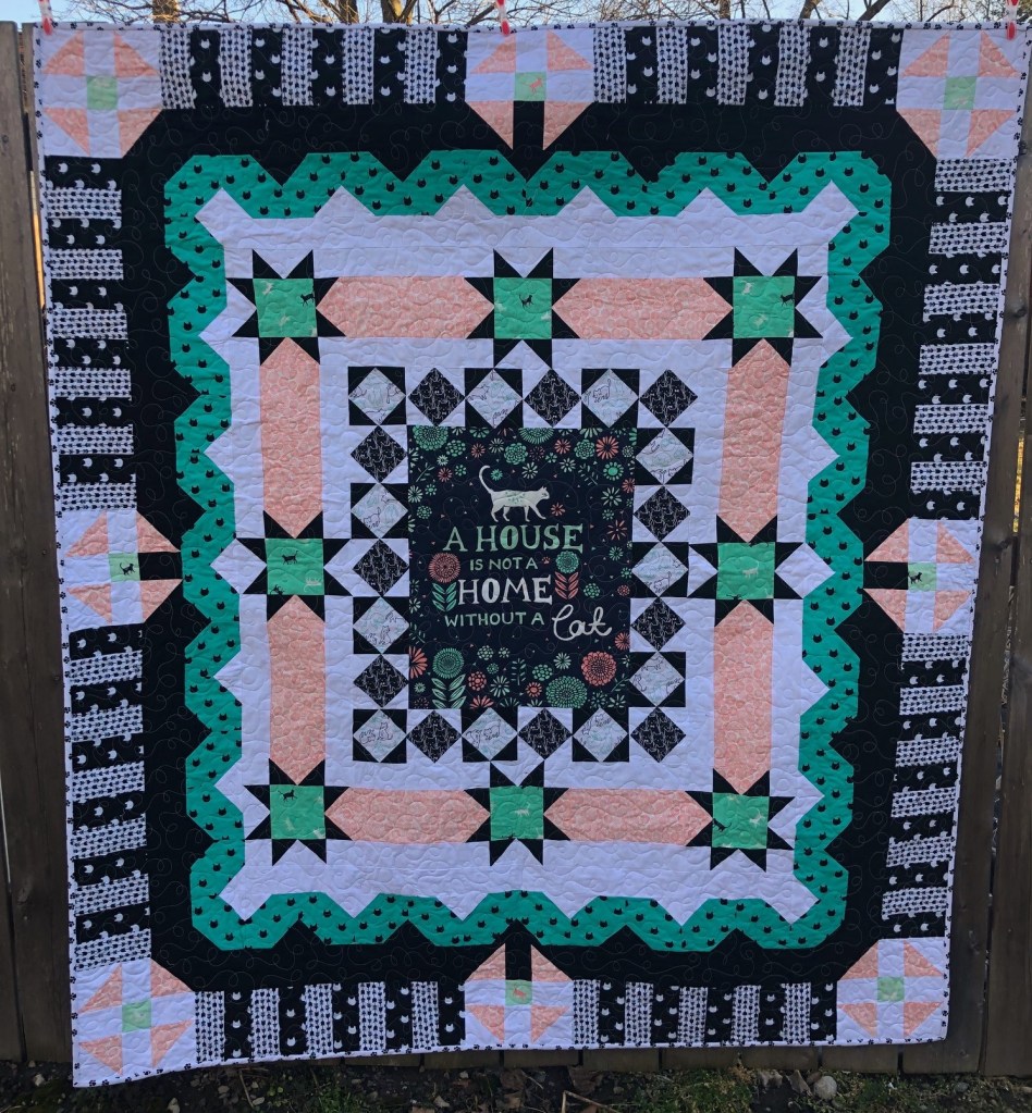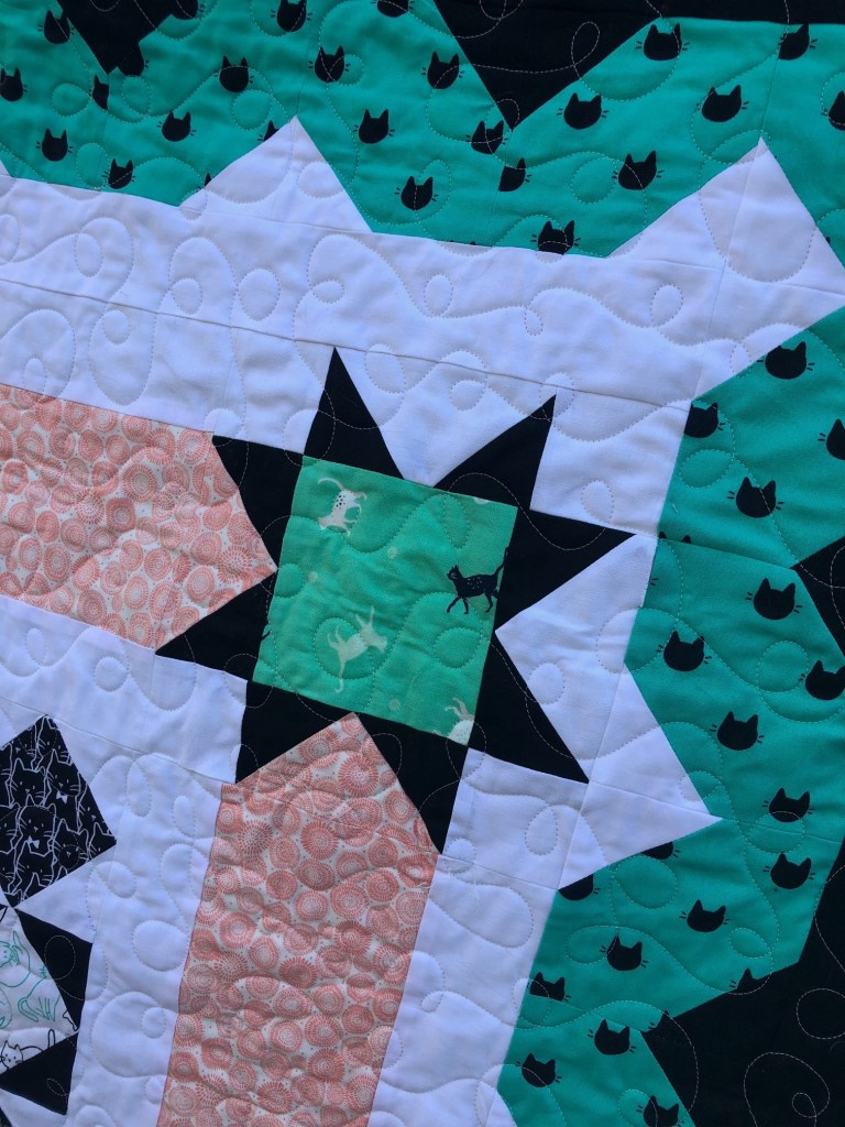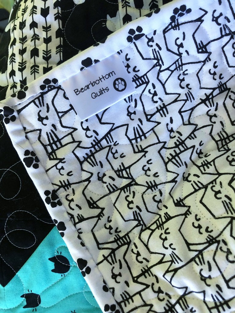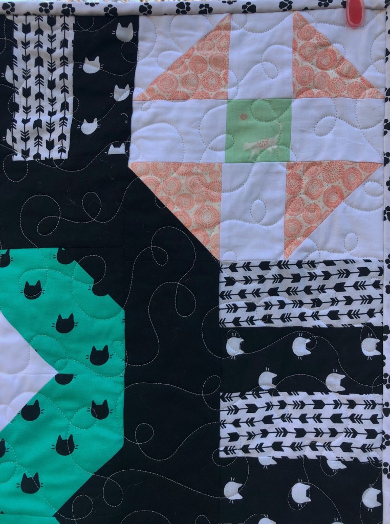 And several different cat-themed fabrics. It finished up at about 64″ x 72″ and it’s all wrapped up with some paw prints, and a lovely cat print backing
