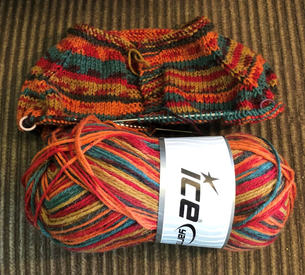 Because baby will be born in May, there wasn’t much point to making warm woolies in newborn/3 month size. So I skipped up to 6 months, which puts us right in the middle of fall, and pulled out this lovely autumnal-looking yarn. I figure it will work well for boy or girl.