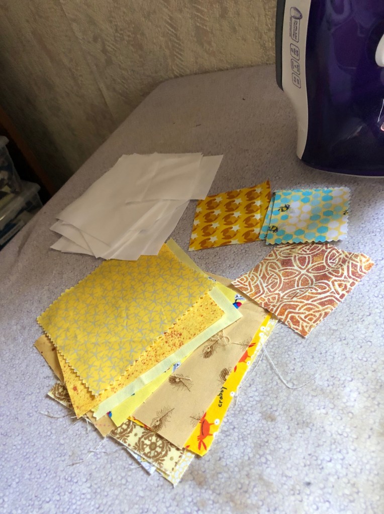 Despite the fact that I love putting yellow in quilts, I didn’t actually have a lot of yellow scraps. I had to raid Mom’s scrap bin when I was there.