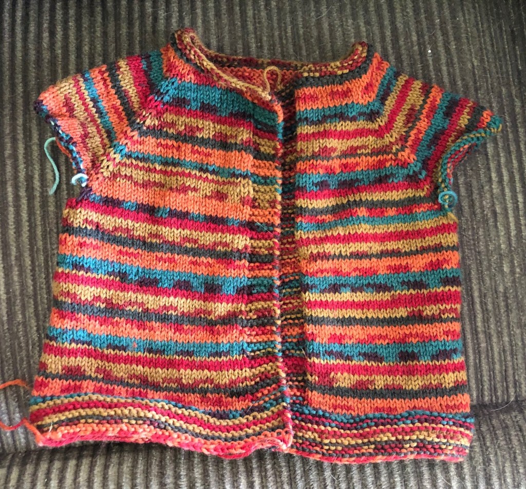I’m making good progress on the baby cardigan. As you can see, the body is done and I’m ready to pick up for the sleeves.