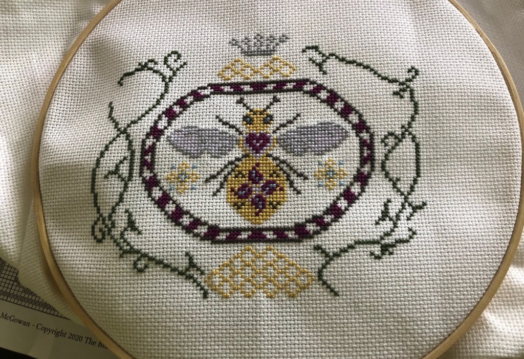 She got some honey comb, and her crown. And I completed most of the vines from which her flowers will grow. I think there’s only a few more weekends work left on this one! I’ll have to start thinking about what to stitch next!