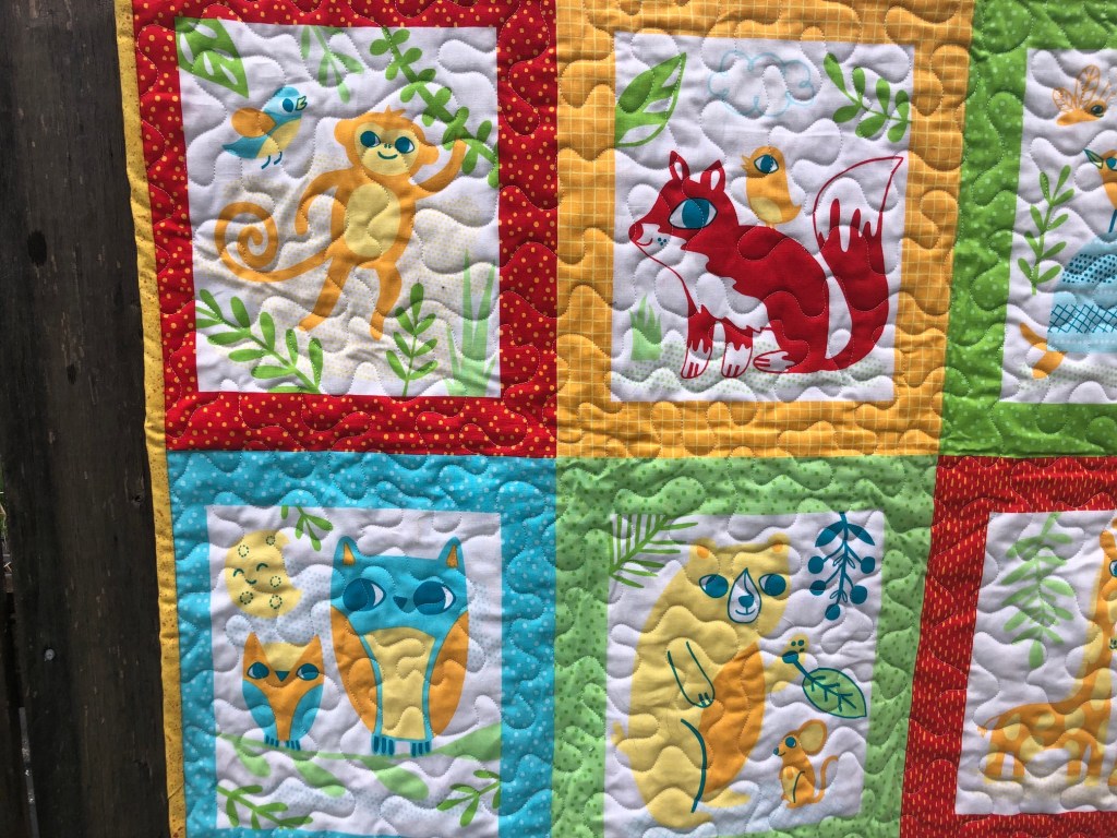 The baby quilt I made for my expecting coworker is complete! I love the simple, bright primary colours and all the fun animals.