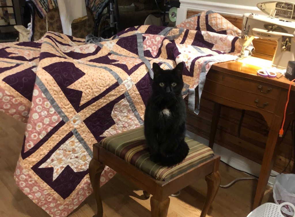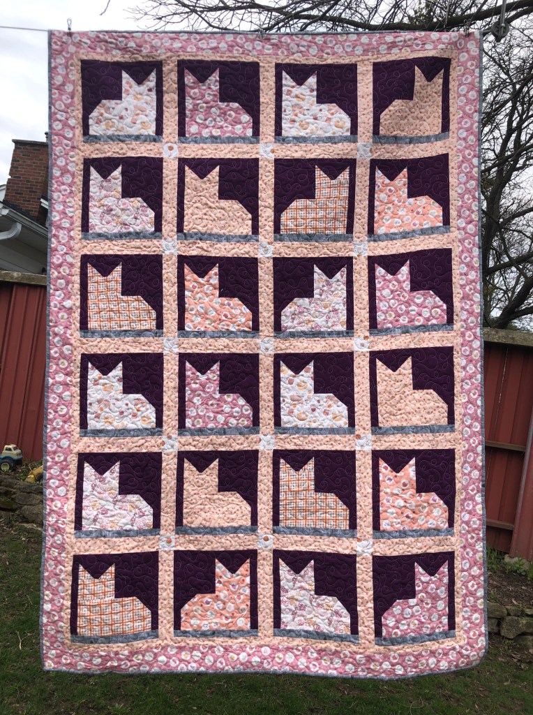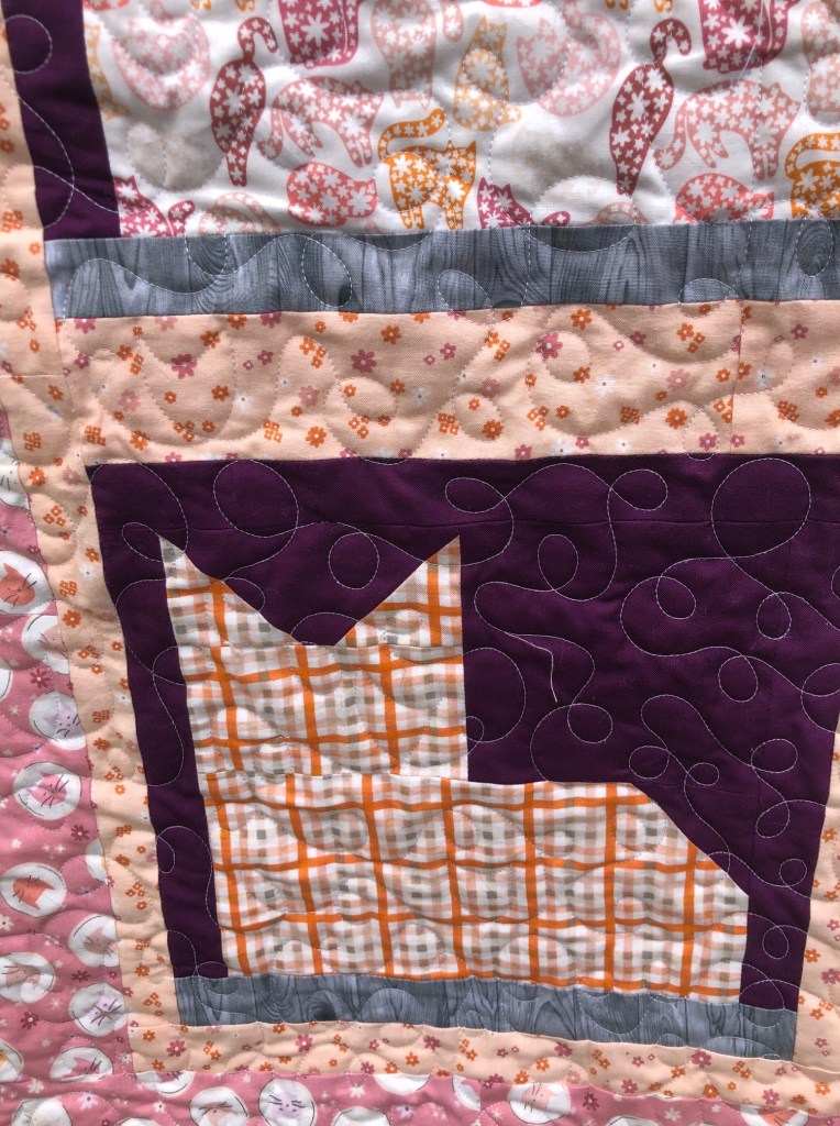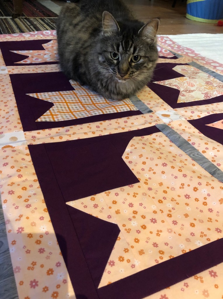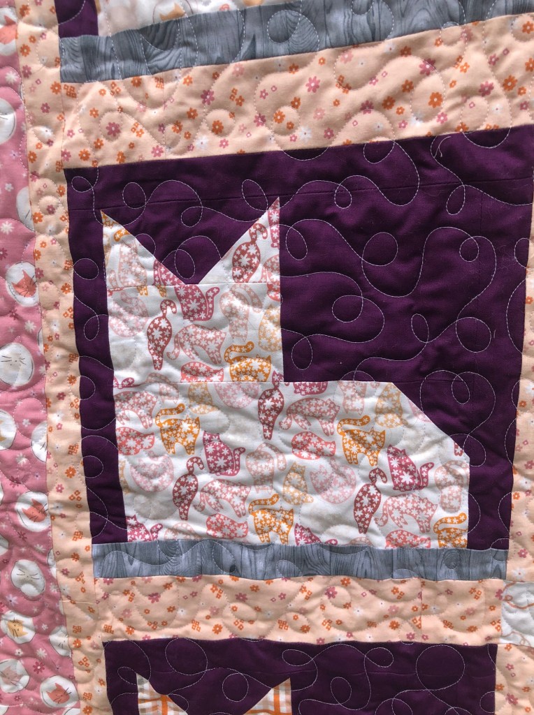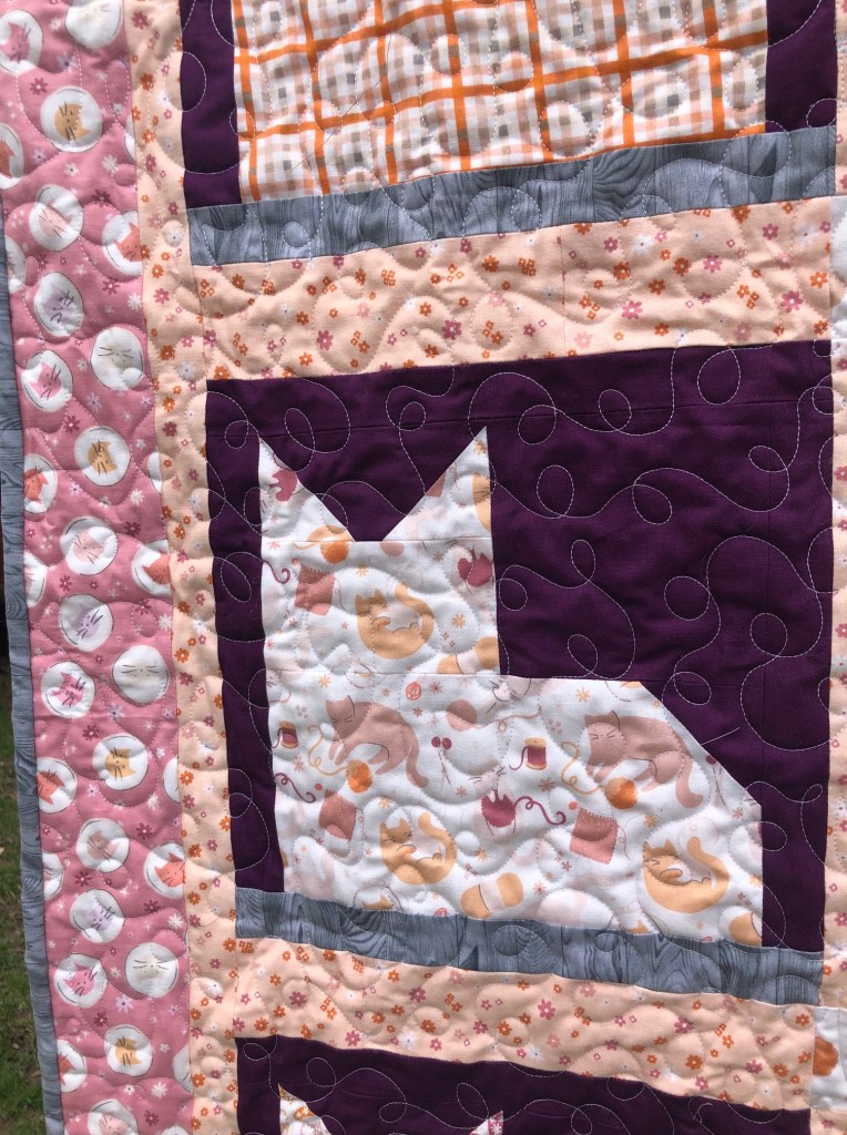 It was orginally just supposed to be a small lap quilt – just something to bring a little extra comfort in recovery. But I kind of got carried away and made too many cats. The end result was a LARGE lap quilt. It ended up being about 56″ x 84″… oops!!!!