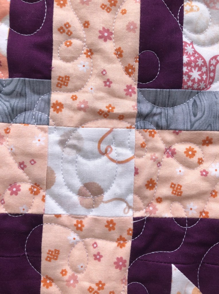 It was made from a fun fat quarter bundle that I bought in secret back in January (when we first found out she’d need surgery). Mom is a big lover or purple and burgundy, but she already has several prints in those colours. I incorporated them of course, but I wanted something a little different and the pink and peach turned out to be just the thing. (And she just loved them.