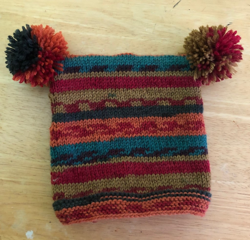 Damn it’s cute!!!! The pattern is Round Head In a Square Hat. It’s a Ravelry freebie. It’s supposed to have ribbing for the band, but I did garter to match the cardigan. And I added the pompoms, because it was just screaming out for pompoms.
