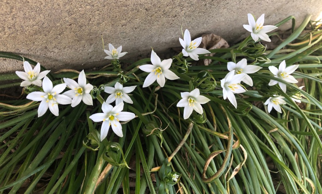 They are Star of Bethlehem flowers. And as pretty as they are, they are also terribly invasive. These one in bloom are at the side of the house under the maple. It’s pretty dry under there, so I think that keeps them a little more in check.