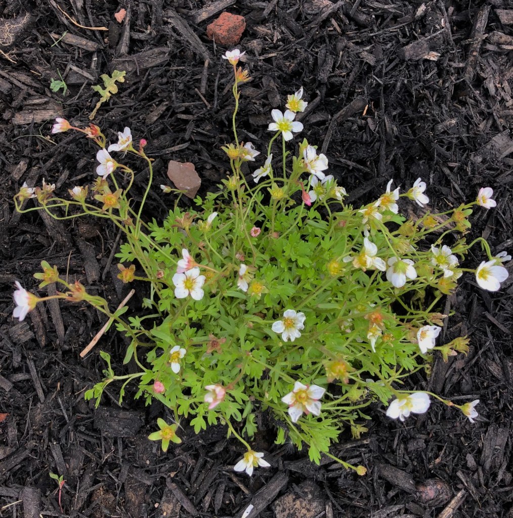 The white and the pink bunches are both rockfoils. But the purpley-blue one is Watperry Blue Speedwell. I have other Speedwell in the catio, but their flowers are long, and bottle-brush-like. The only thing they have in common with this one is the shape of the leaves.