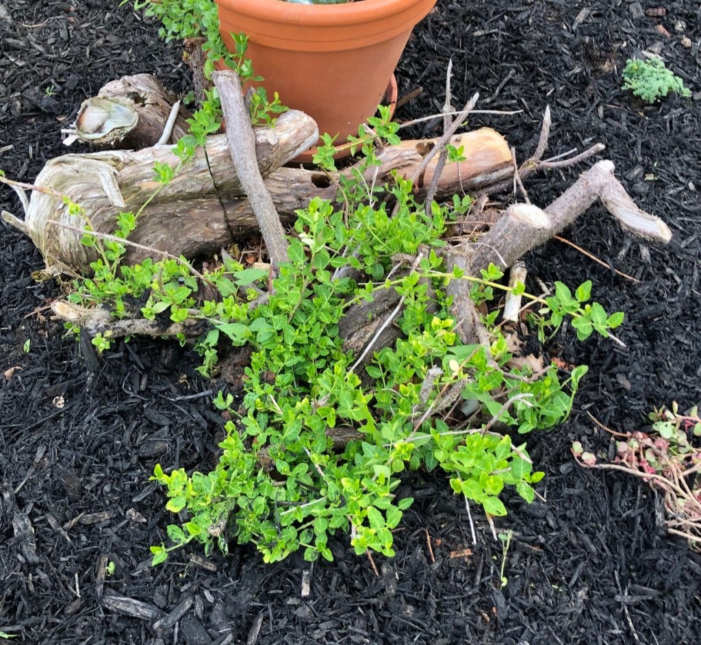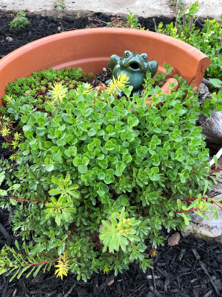 It’s full of ground covering sedums too (and a dollar store frog), so I figure it fits right in. Behind it, is where the Euonymous is regrowing.