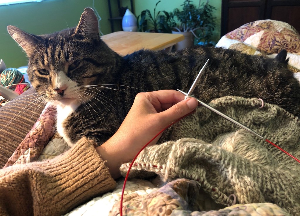And if I’m not sitting, I’m not knitting… (or making a lap for Relic)