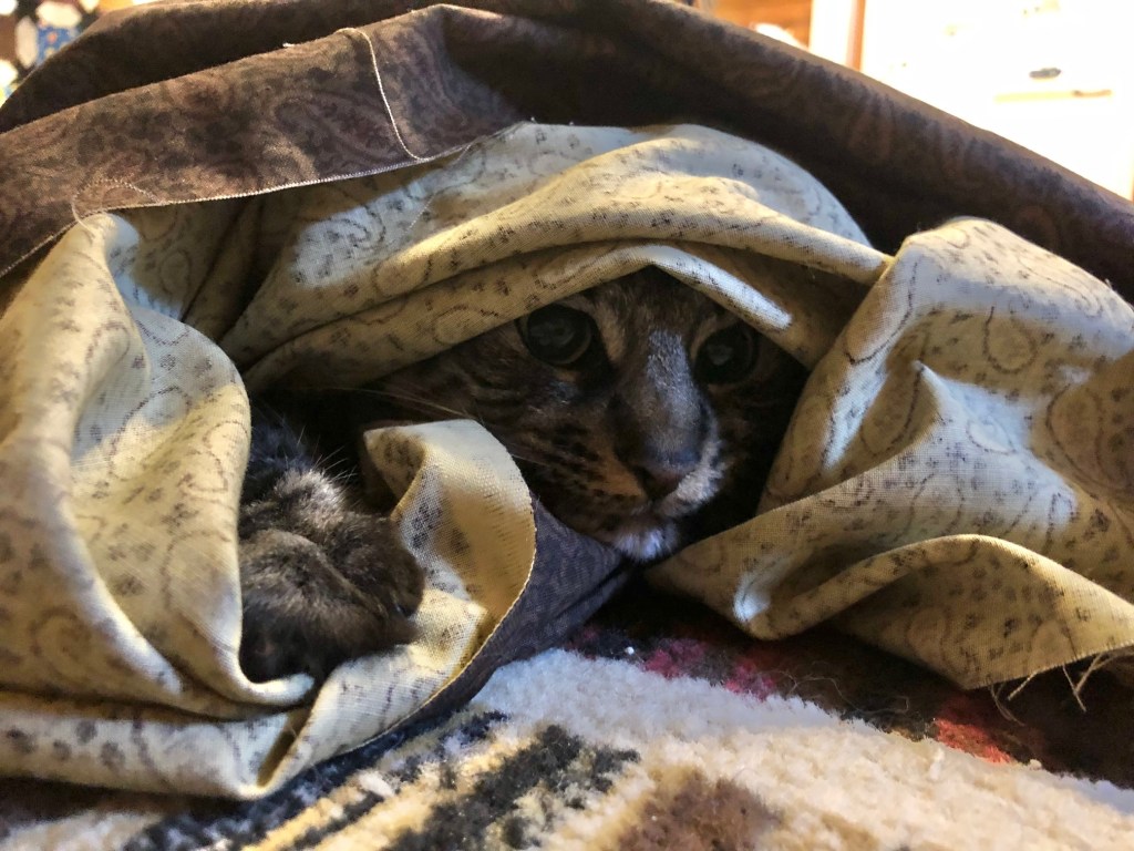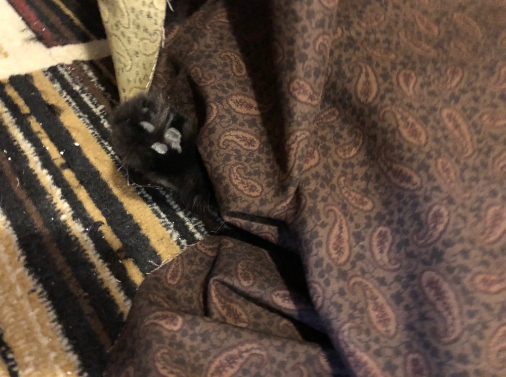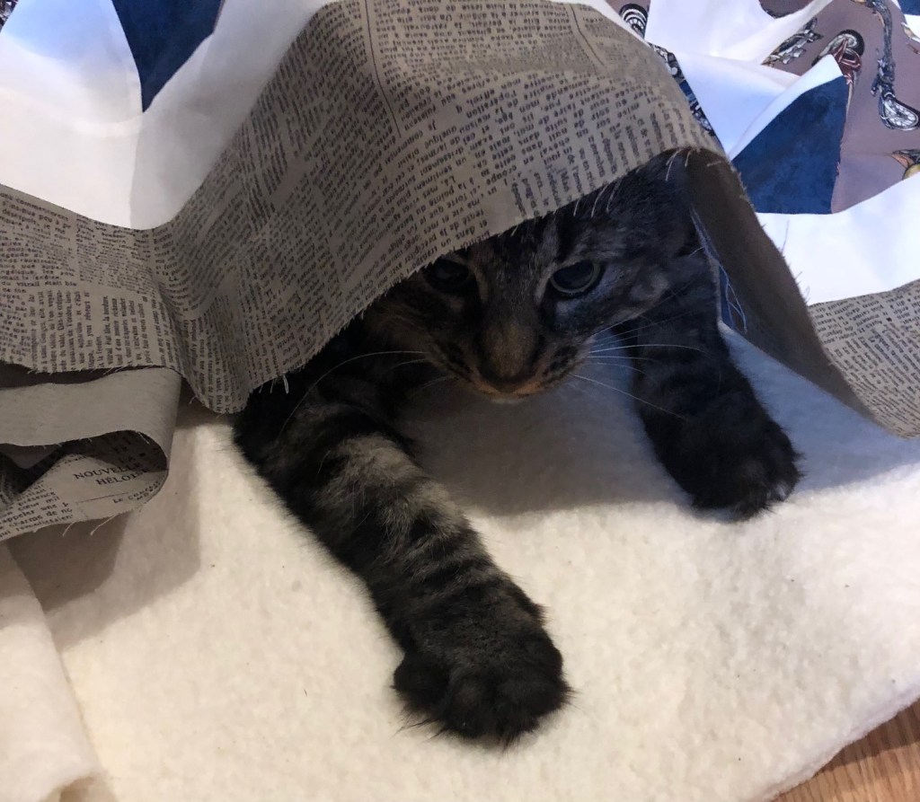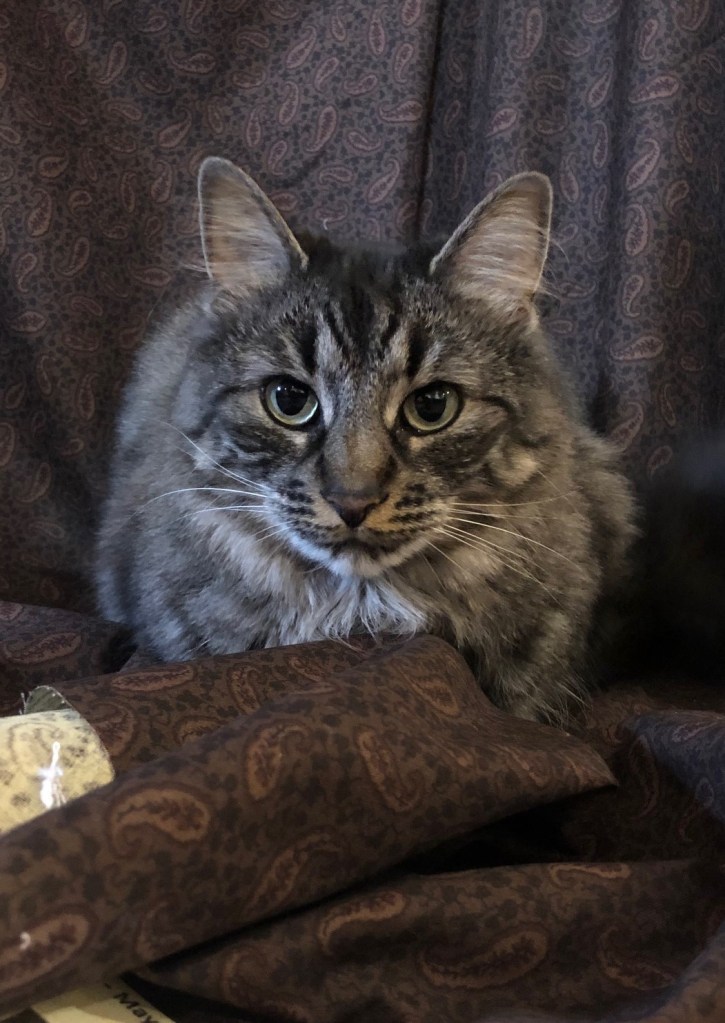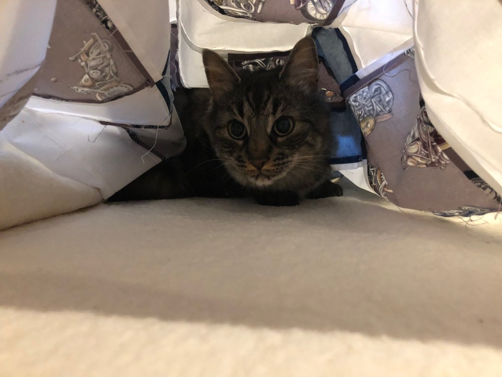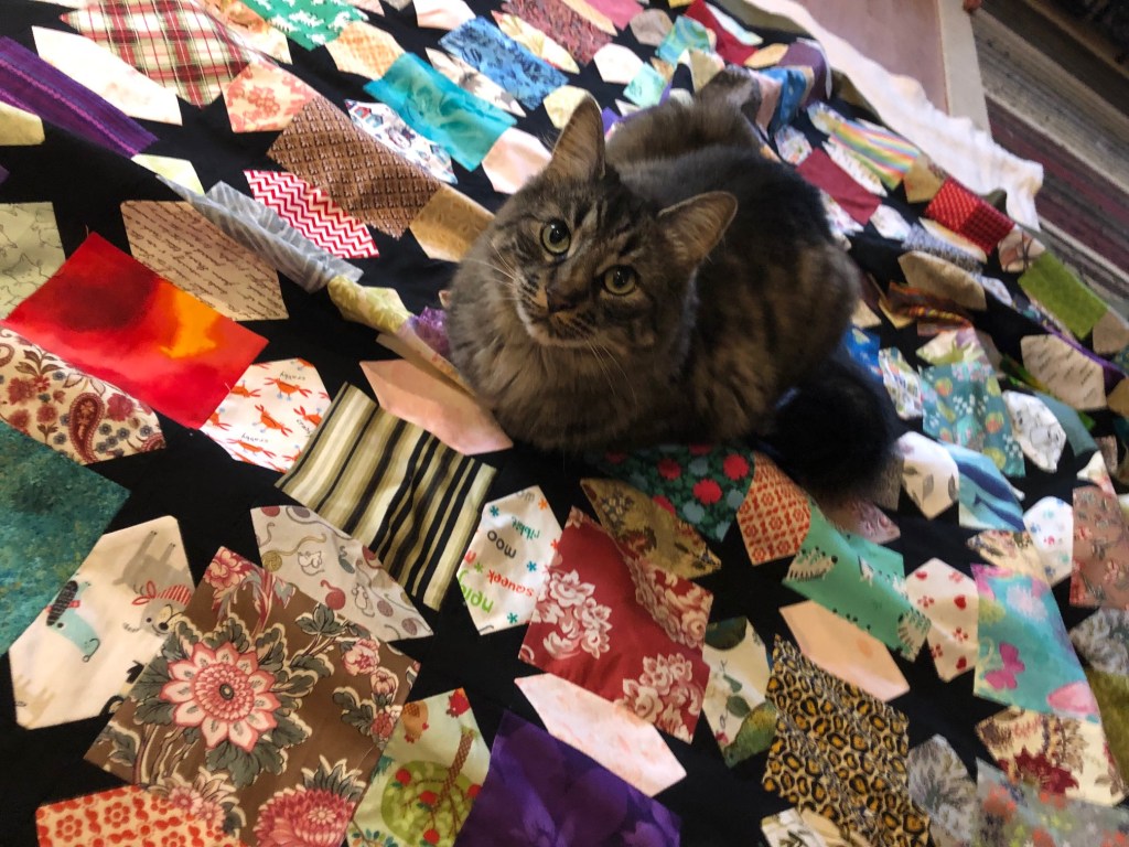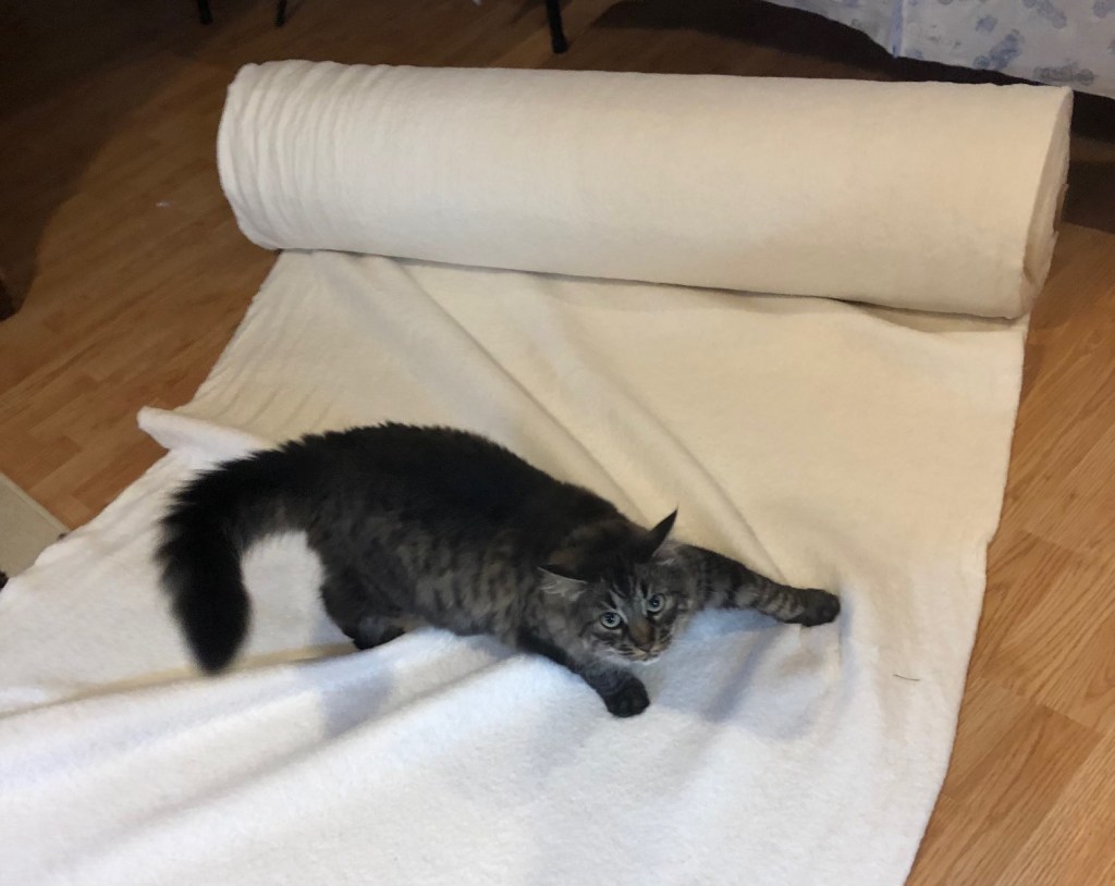 She is especially suspicious of the the sandwiching process, and has to make sure I’m not trying to hide anything in the fabric or batting…