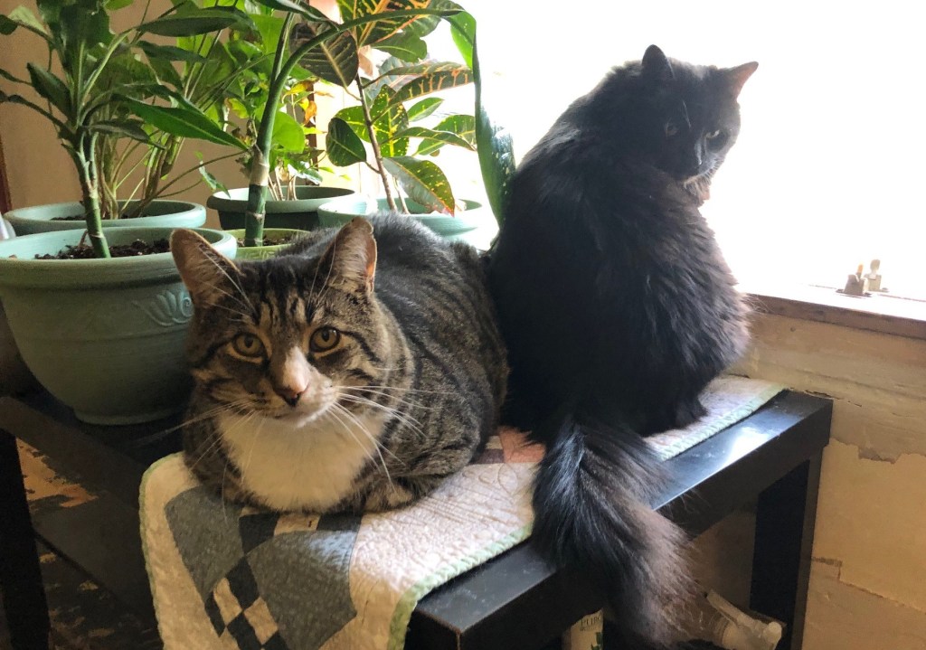 Based on the looks you’re getting, I don’t think they appreciate being called portly. 🙂 Putting the table in front of the window looks like it was a great idea, both for the plants and the kitty’s.
