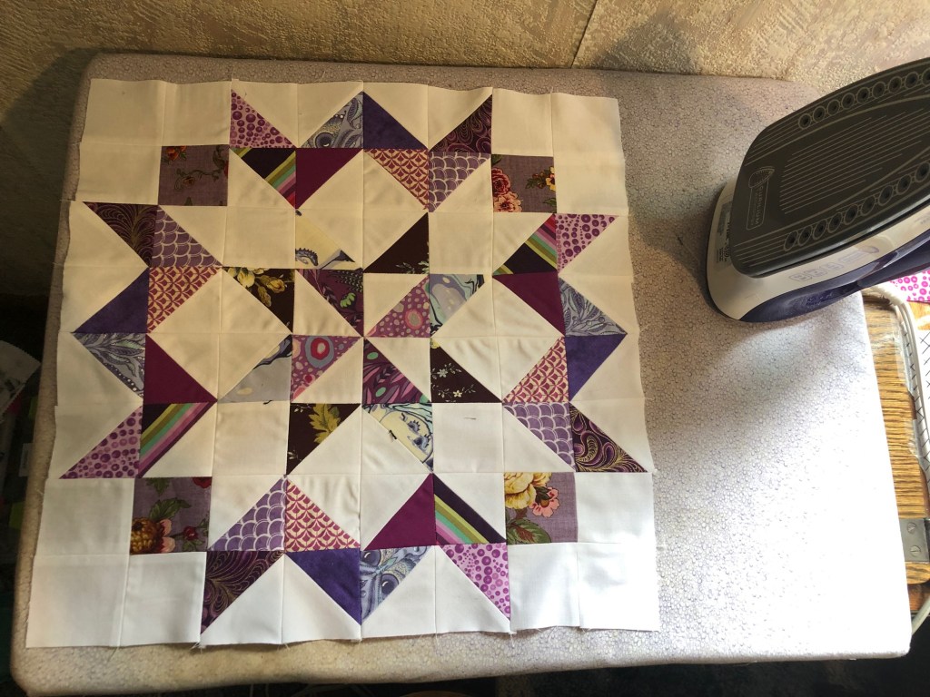 The purple block is beautiful! Actually, all the blocks are beautiful. Love the look with the blocks on point. It’s amazing how much difference it makes when doing that.